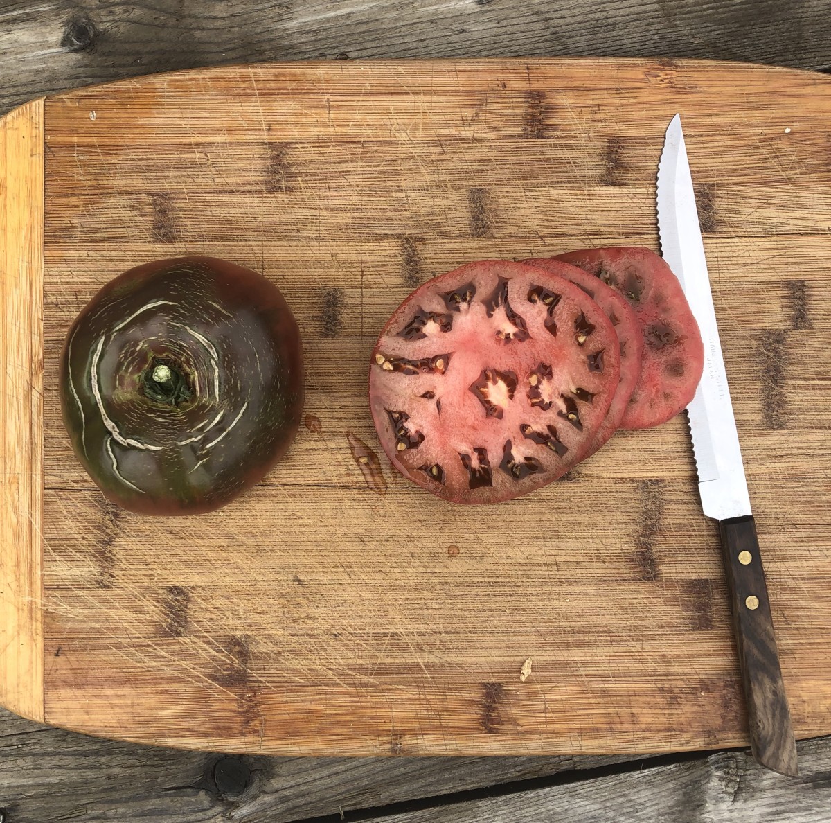 Indeterminate with potato-leaf foliage. Also known as True Black Brandywine. Not the only attempt at pairing the smoky depth of “black” tomatoes with the full tart and sweet balance of Pink Brandywine, but Weaver’s Black could be the oldest and is likely the best flavored.