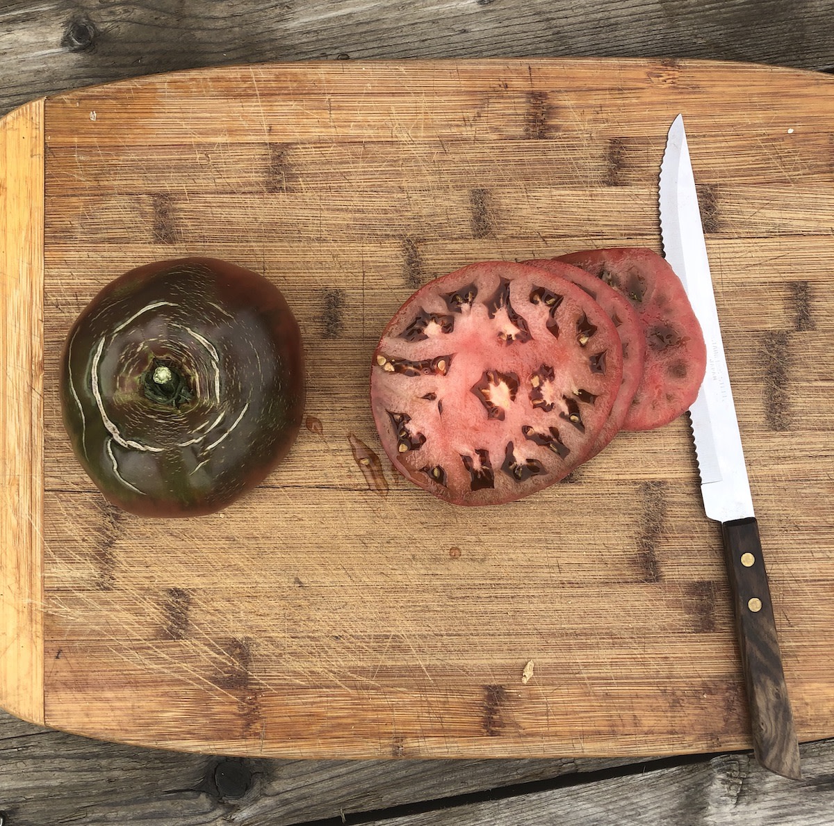 Bred by Dr. Harold Martin in late 1920s in Pennsylvania, its irregular flattened large heirloom beefsteak shape looks coal dusted over crimson, with shadows of green, purple and brown. Winner of our 2016 taste trial of dusky types, Weaver’s flavor intensity of peaty whiskey and rich tomato is not for the faint of heart, and everyone who tries it will have an opinion.