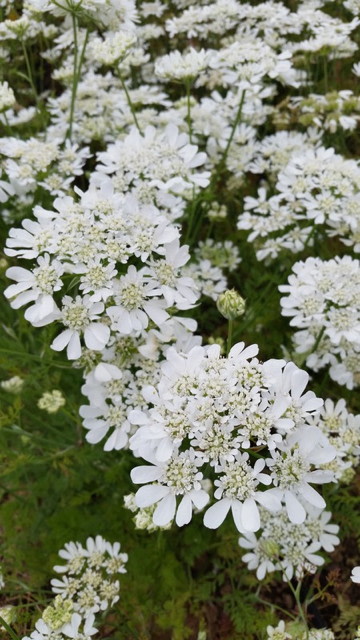 Annual. Though the bird hails from Australia, with this beauty in your garden, you can add white finches to your backyard annual count. The White Finch flower exhibits a dainty delicacy resembling lace-cap hydrangea, with the central florets of a flat-topped cluster surrounded by a ring of larger flowers that might, poetically, resemble the fluttering of birds’ wings. The plant stands tall at 2–3' with ferny foliage and sturdy stems. Deadheading will keep the flowers coming until frost. For long-lasting enjoyment as an airy addition in bouquets, harvest before the pollen starts to shed. When dried, the seed pods can also be arranged to interesting effect. Best direct seeded. Full sun.