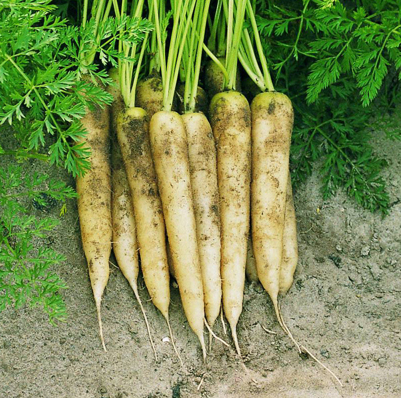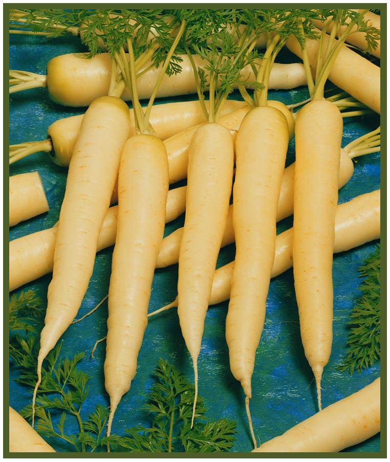 Satin, a Nantes-Imperator cross, is by far the best white carrot we’ve trialed. Hillary Nelson of Canterbury, NH, says its classic 8" roots are “some of the most perfect looking carrots I’ve grown—straight and long,” with the ideal carrot shape in a pleasing creamy white. Sweet and crunchy when eaten raw, it has none of the wild carrot taste or hairiness typical of other white carrots. When cooked it is sweet and mild with a smooth texture. Develops 1" green shoulders when mature. Medium core. Contains 2% orange off-types.