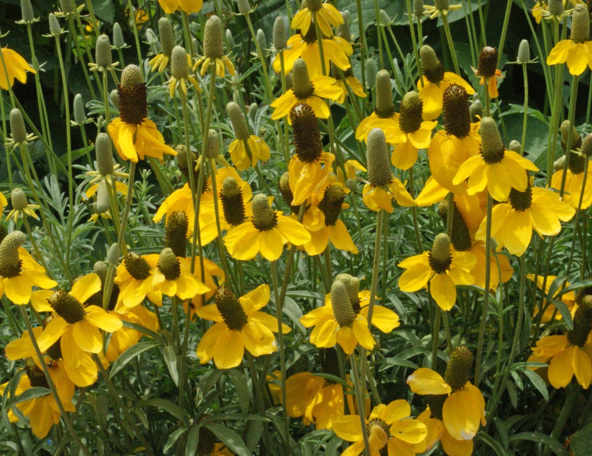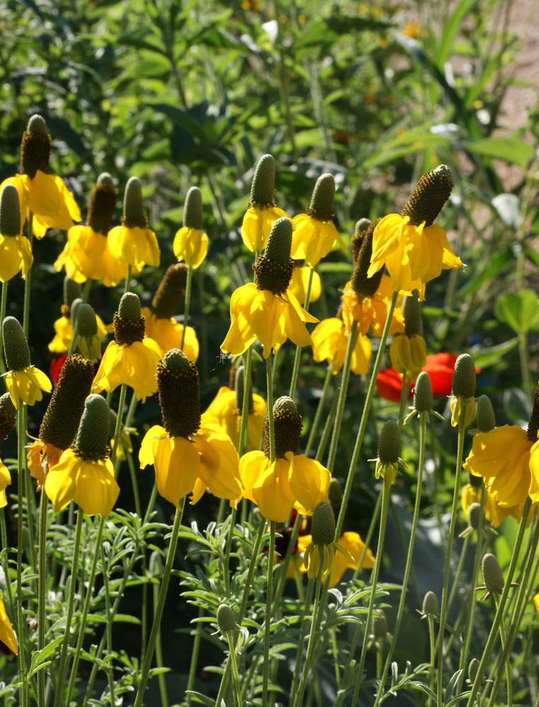 Perennial to Zone 3. One recent summer, I was enticed into a field by a yellow fluttering of dancing flowers on erect 1–3' slender stems. As I approached, I could see that the yellow petals merely skirted around a protruding cylindrical chocolate-brown center disk. One of its common names Mexican Hat evokes a tall sombrero and the lively and colorful Mexican Hat Dance. Prairie grasslands native likes full sun, blooms May through August, undaunted by drought. ~1,830 seeds/g.