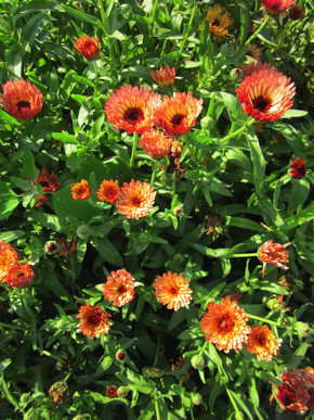 Annual. Pinky-maroon backing shows through the yellow petals to lend a pink tinge to the familiar calendula-yellow. Dark centers accentuate the color contrast. A Frank Morton original.