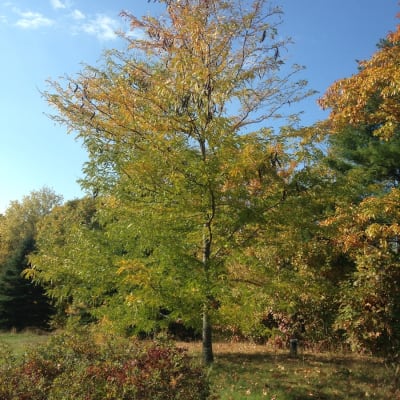 Carya 70-90' × 50-70'. Straight trunked with shaggy bark and branches that curve up at the tips. Bears sweet edible nuts in 40 years. Z4.