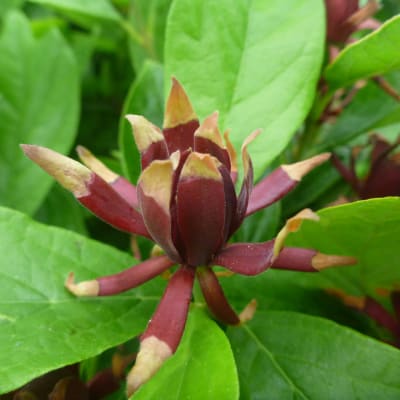 Calycanthus floridus 6-10' x 6-12'. Beautiful native shrub with dark burgundy-maroon flowers and shiny leaves. Blooms early, flowers through summer. Highly fragrant. Z4/5.