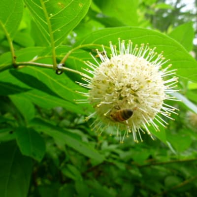 Cephalanthus occidentalis 6-10' x 8'. Loose rounded branchy shrub with masses of ornamental blooms that appear 4–6 weeks in summer. Attractive to pollinators. Z4.