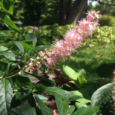 Clethra alnifolia 4-5' x same. Red buds and beautiful spires of heavenly scented deep-pink flowers appear for 6 weeks in midsummer. Erect oval habit. Z3.