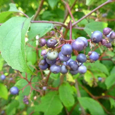 Cornus amomum 8-12' x same. Large rounded long-limbed shrub. Effective for erosion control, wildlife or pollinator habitat. Maroon bark visible in winter. Suckers and spreads. Native to eastern U.S. Z4.