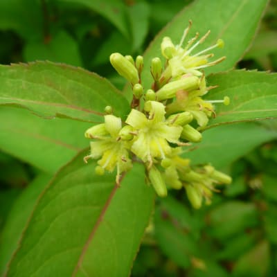 Diervilla lonicera 2-4' x 2-5'. Clusters of yellow tubular flowers attract pollinators. Lustrous green leaves emerge with a hint of bronze. Good for erosion control. Z3.
