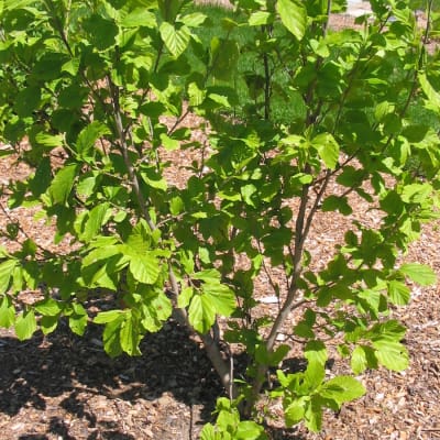 Corylus americana 12-18' x 10-15'. Multi-stemmed native shrub with sweet nuts. Showy catkins in spring. Patchwork of colors in autumn. Can bear in 3-5 years. Z4.