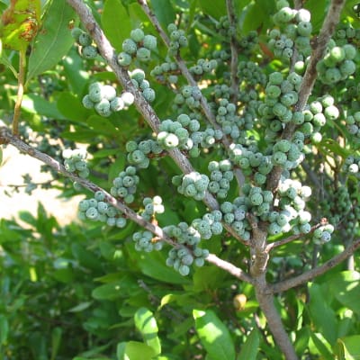 Magnolia virginiana 10-20' x same. Fragrant creamy white 2”3" waxy blossoms in mid-spring sometimes rebloom in mid-summer. Pink fruits adorn the tree in fall. Tolerates clay and air pollution. Z5.