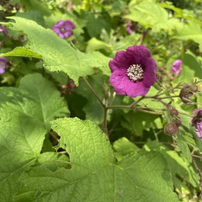 Rubus odoratus 3-6' x 6-12' Relative of the cultivated raspberry, with fragrant flowers and nutritious fruit. Thornless, long-blooming, attractive to pollinators. Excellent addition to wildlife hedges. Z4.
