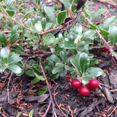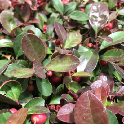 Gaultheria procumbens 6-10". Aromatic evergreen native groundcover. Glossy dark green leaves. Bell-shaped white flowers in June. Vivid red berries. Self-pollinating. Z3.
