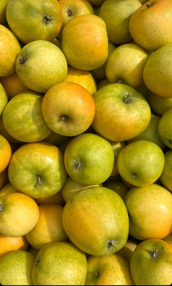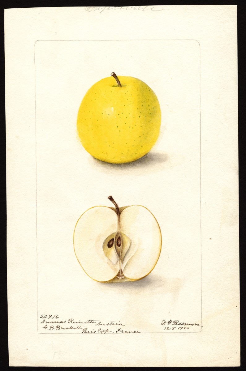 Medium-sized rounded-conic, sometimes oblong, fruit has rich golden skin dotted with russet freckles. The name translates to ‘Royal Pineapple’ and the crisp fine-grained flesh is tangy, tart and sweet right off the tree with a citrusy pineapple flavor. These are good keepers; in storage the golden skin deepens to almost orange, while the flesh gets noticeably sweeter without losing its zest. Also good for cooking and pressing.