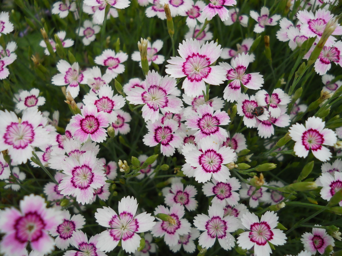 6-8" tall. A traditional cottage-garden stalwart. Spicy clove-scented blossoms with dainty white serrated flower petals and a magenta-red ring around the center eye. A stunning combination of fragrance, foliage and flower. Makes a carefree, naturally neat and tidy addition to the rock garden or sun-drenched path.