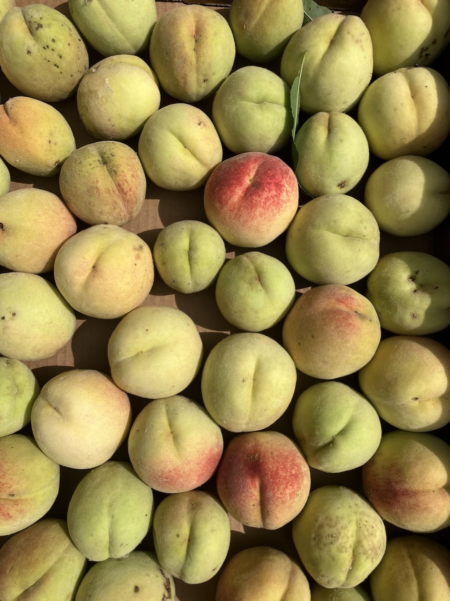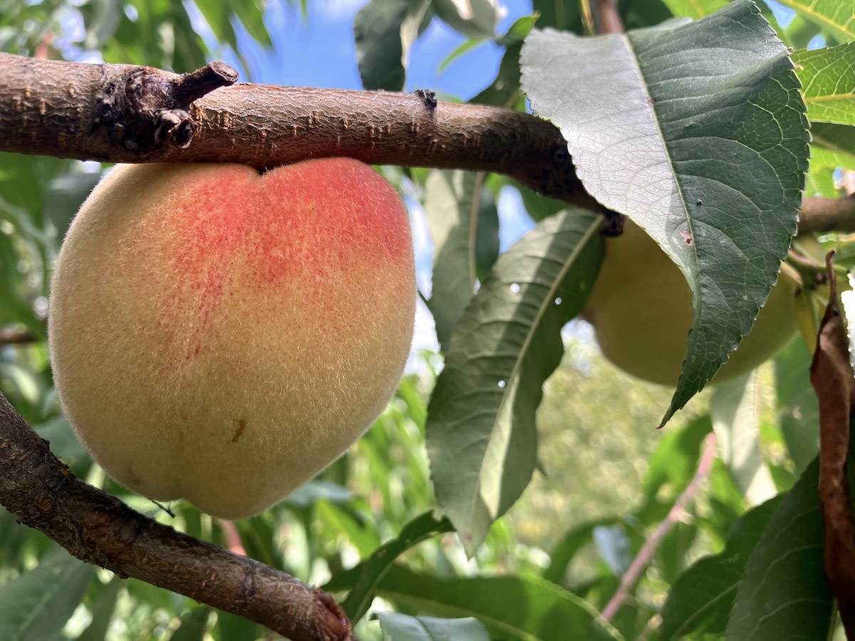 Old-time white-fleshed favorite, surprisingly hardy in spite of its origin. Large beautiful roundish-oval cream-colored fruit with a bright red blush and thin tender skin.Flesh is white, tinged with red, and firm, melting, juicy. Freestone. Very good fresh eating, cooking and canning.