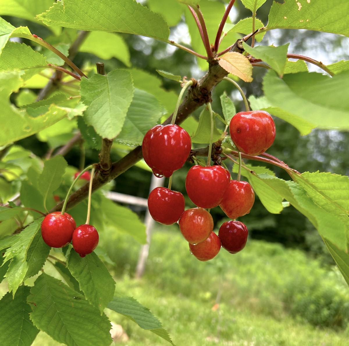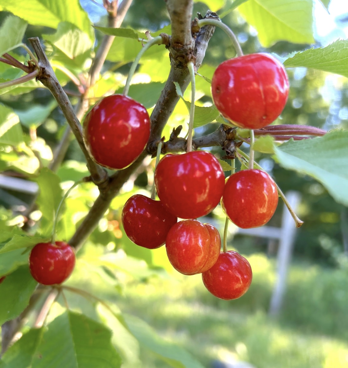 Highly flavorful large firm deep red cherry resembles Bing. Neighbors reported that the cherries on their young tree had a sweet chin-dripping heavenly flavor that made them think of little plums dressed up in cherry suits. Less susceptible to cracking than other varieties. Flowers almost a week later than other sweet cherries, potentially missing late frosts. Vigorous upright and spreading growth. Self-pollinating. Z5. (3–6' grafted bare-root trees)