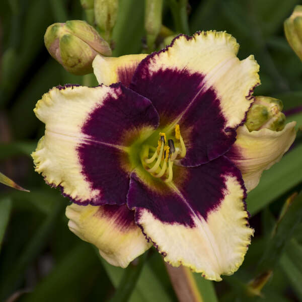 24-30" tall. This flamboyant swashbuckler features 4½–5" blooms with light yellow to buttercream recurved petals and a deep Malbec-purple, nearly black, eye. The chartreuse throat and yellow stamens flash like buried treasure. This tetraploid is not officially classified as a rebloomer, but has been observed to do so prolifically. Early to midsummer blooms, around early July in Maine. Z2.