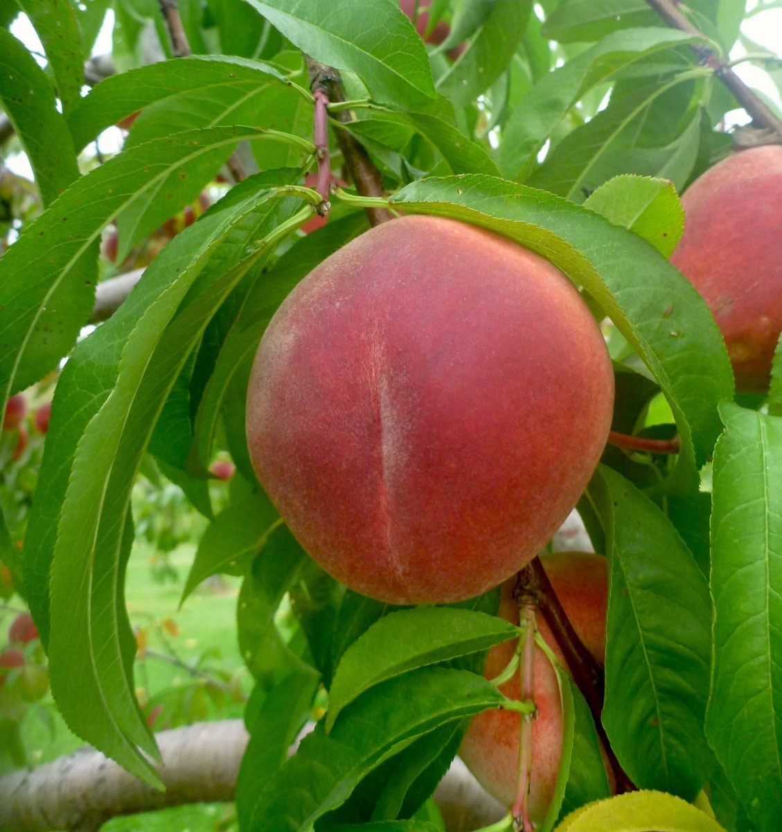 Very good fresh eating. The flesh is white, tinged with pink, turning red at the pit. Completely freestone and non-browning when cut. Ripens about 20 days after Redhaven. Tree is hardy, open-growing and resistant to bacterial spot. Doing well in our Maine orchards and worth trialing in much of the Northeast. Z4/5. (3–6' bare-root trees)