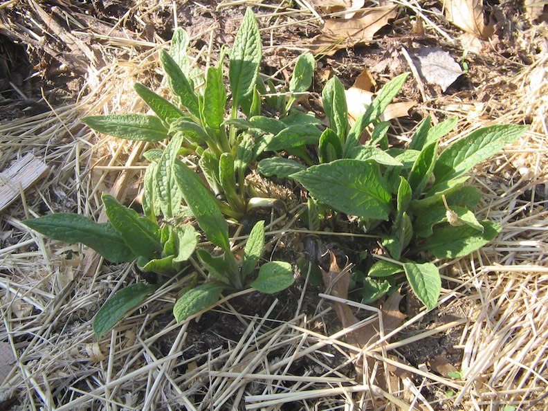 Highly recommended as a companion plant for orchards. We scythe and gather up the leaves for mulch, or to add to compost piles or compost teas—it is rich in silica, nitrogen, magnesium, calcium, potassium and iron. Clusters of bell-like magenta-purple flowers dangle above the deep green bristled foliage. Russian comfrey is thought to have a higher pyrrolizidine alkaloid content than the species. S. officinale is preferred for making herbal medicines.