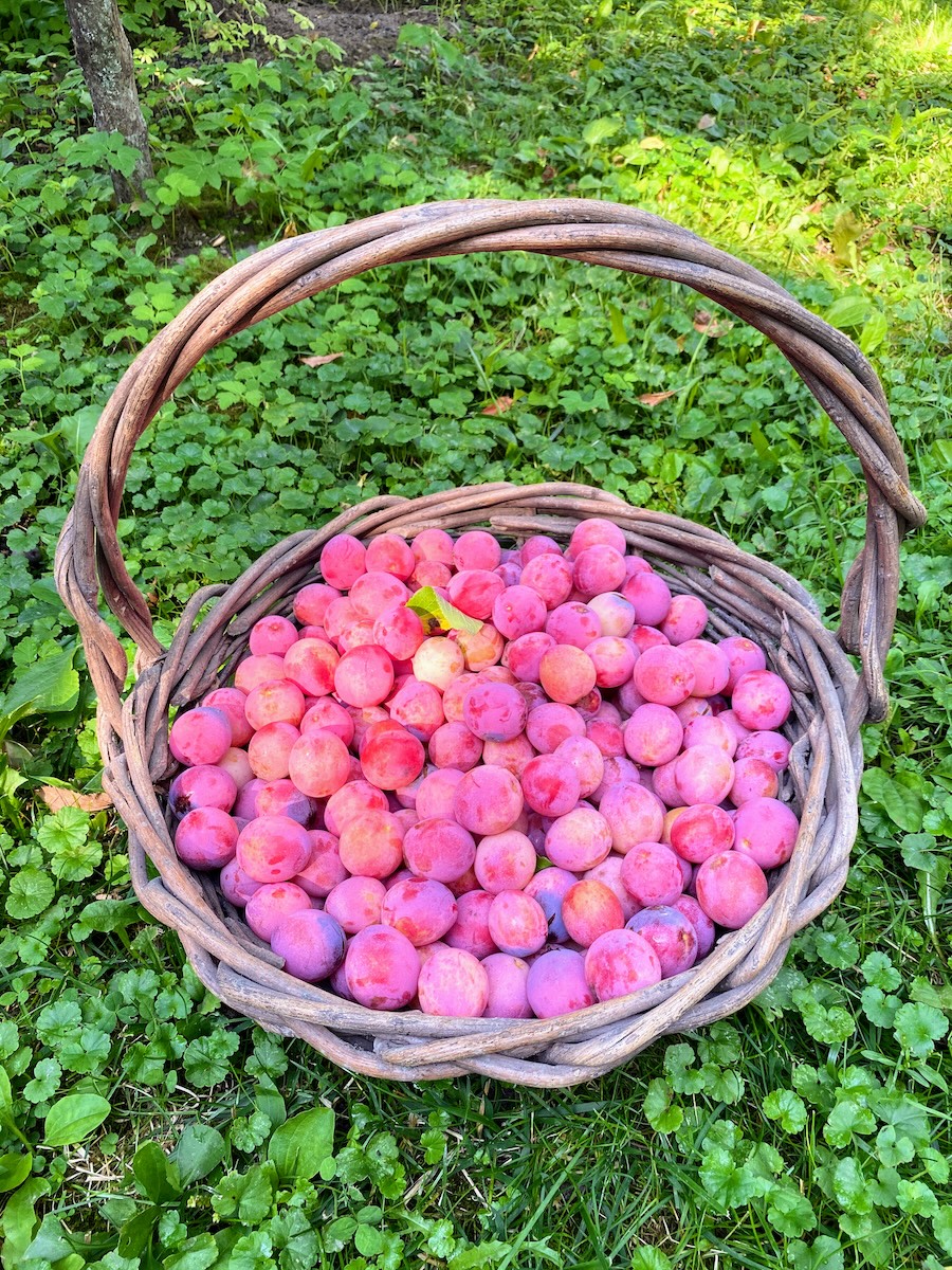 The species is the northernmost plum in North America, native from Maine north and west to the prairies of Manitoba. Very cold hardy. Prunus americana and hybrid plums will pollinate it. Our friend Michele brought this plum to John’s annual grape arbor potluck. They were dazzling and delicious and when she said her tree bears year after year all by itself we couldn’t believe it. But it’s true! Z3.