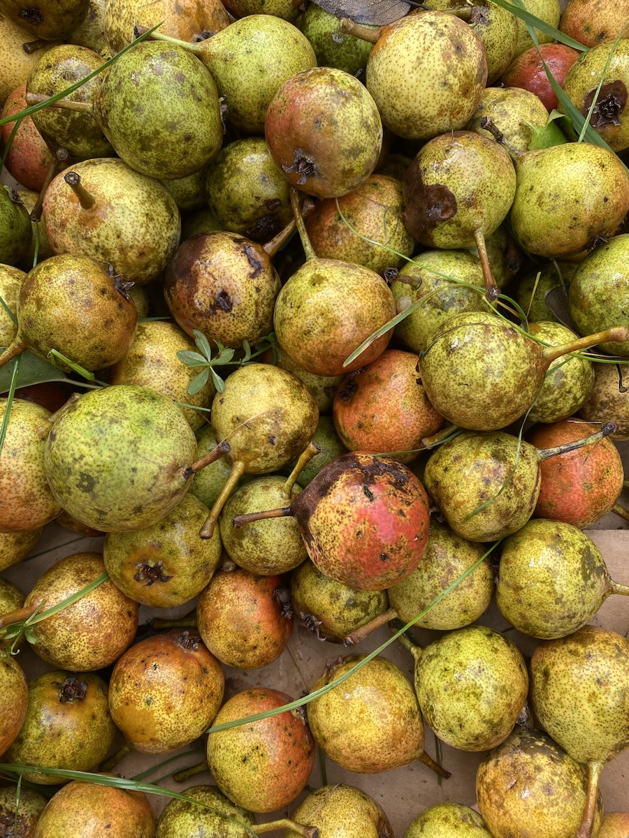 Too bitter for fresh eating but very good for making a strong aromatic perry. Also suitable for cooking. Medium acidity, low tannin. (SG 1.069) Small roundish-pyriform yellowish fruit with a reddish blush. Brandy was one of the pears used by James Marsden and Helen Woodman in the delicious perry we drank at their Gregg’s Pit Orchard in Herefordshire. Their press had a large flat grooved stone base that looked to be about 300 years old. It probably was.