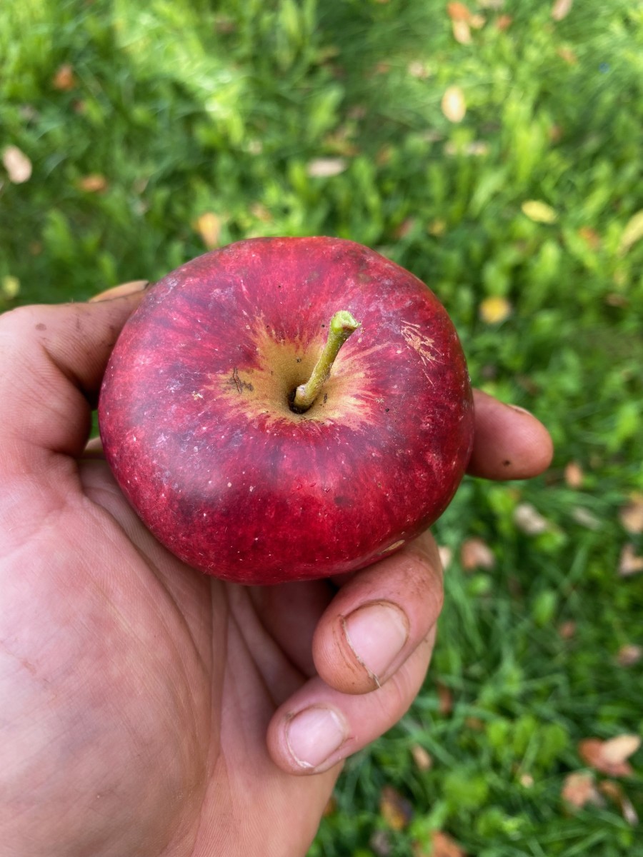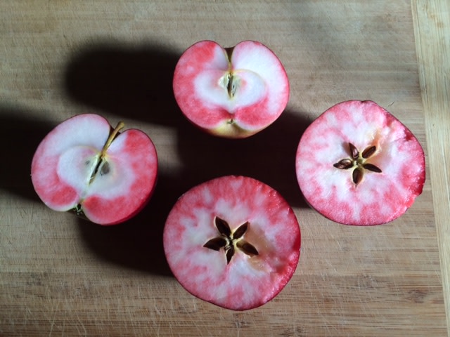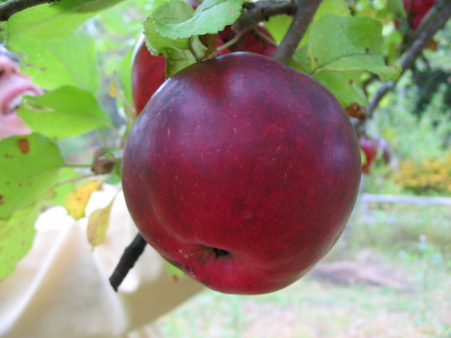 Northern Aroostook County fruit growers Steve and Barb Miller introduced Burgundy to us as Barb’s favorite cooking apple. Striking for its large (3") size and glossy purplish-red roundish fruit. Waves and rays of red in the firm juicy flesh. Strong distinctive aroma and a pleasantly unique flavor with a tart zingy aftertaste. One taste tester said, “Wow, hey, that’s really different!” Steve said, “It reaches out and grabs you!” Makes an aromatic well-balanced early cider.