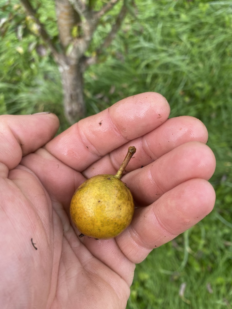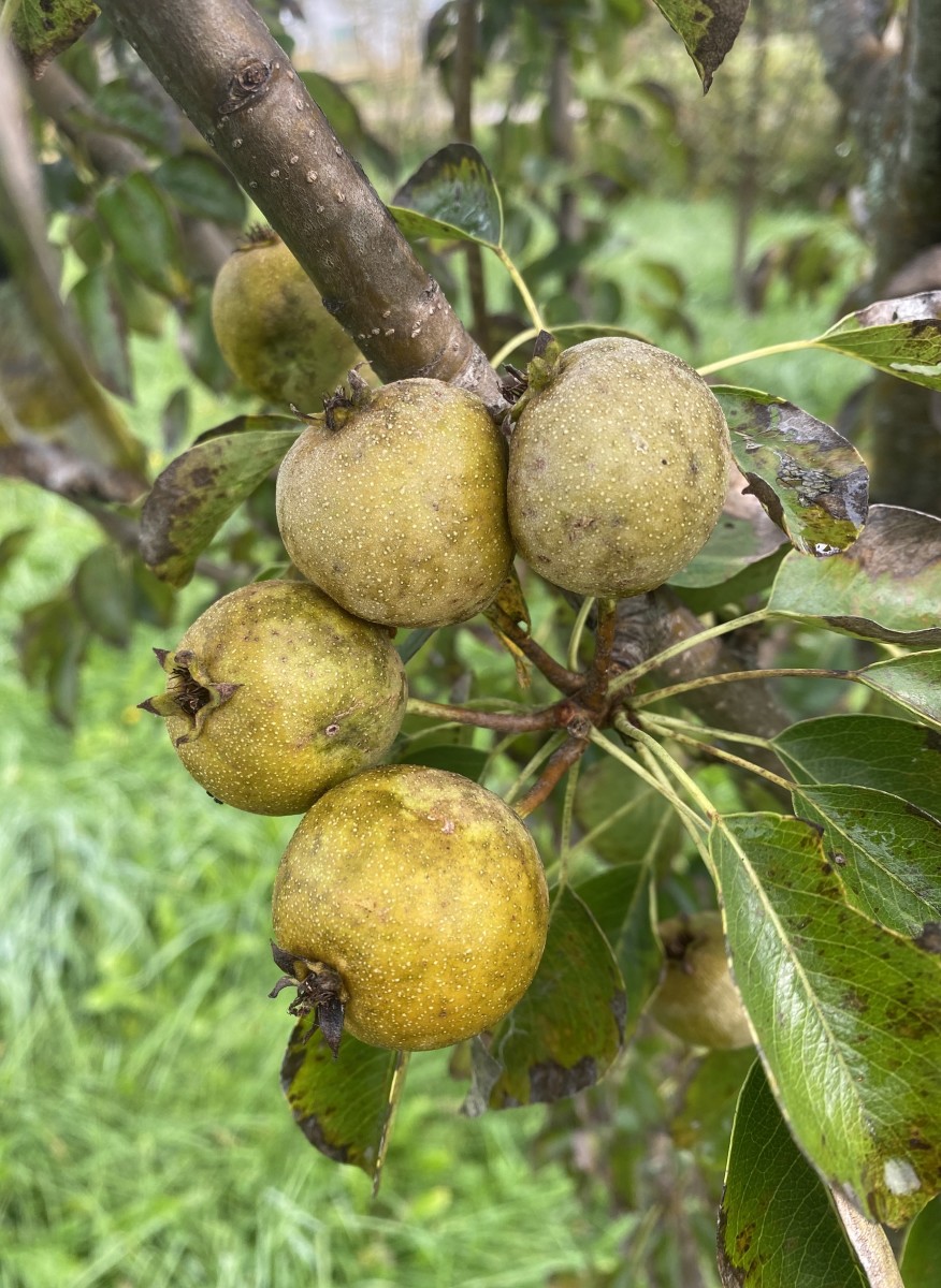Bittersharp with medium acidity and high tannin—everything you want for the perfect perry. Small (less than 2") yellow-green turbinate or roundish-obovate fruits ripen late. The old saying goes: “Gather your Butts one year, mill them the next and drink the year after.” You pick them in the late fall this year, press them in January and drink the perry the year after that. Best blended with other perry pears. Z4.