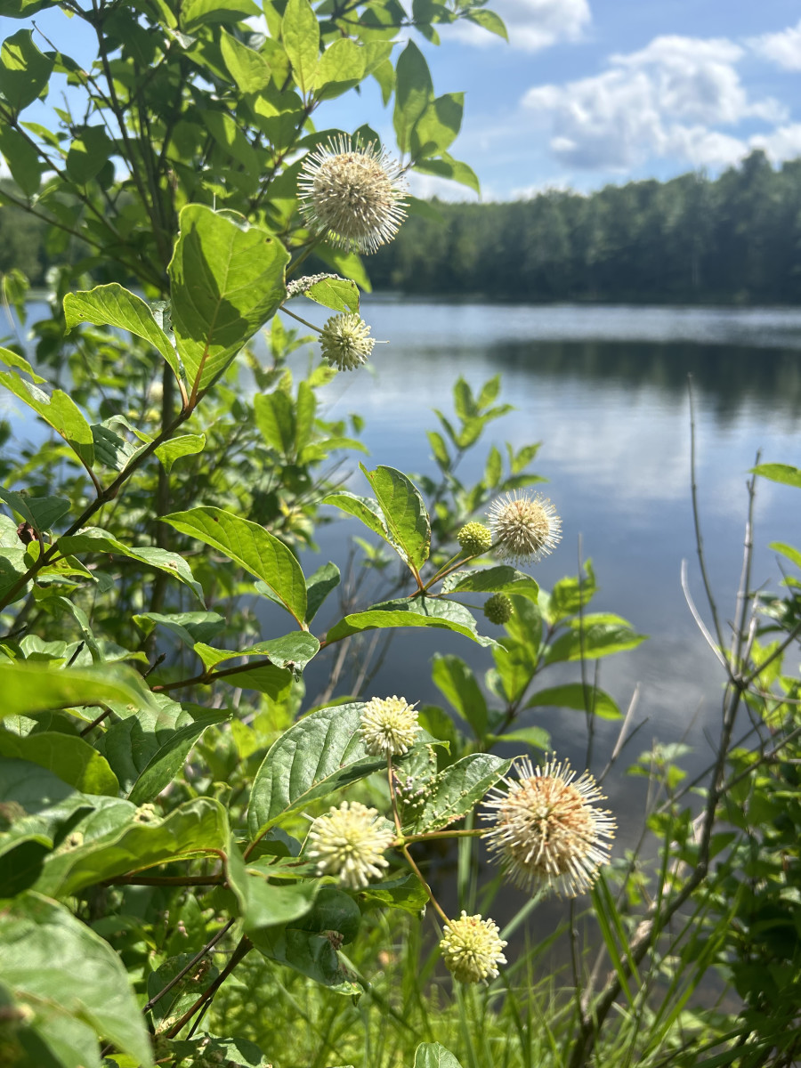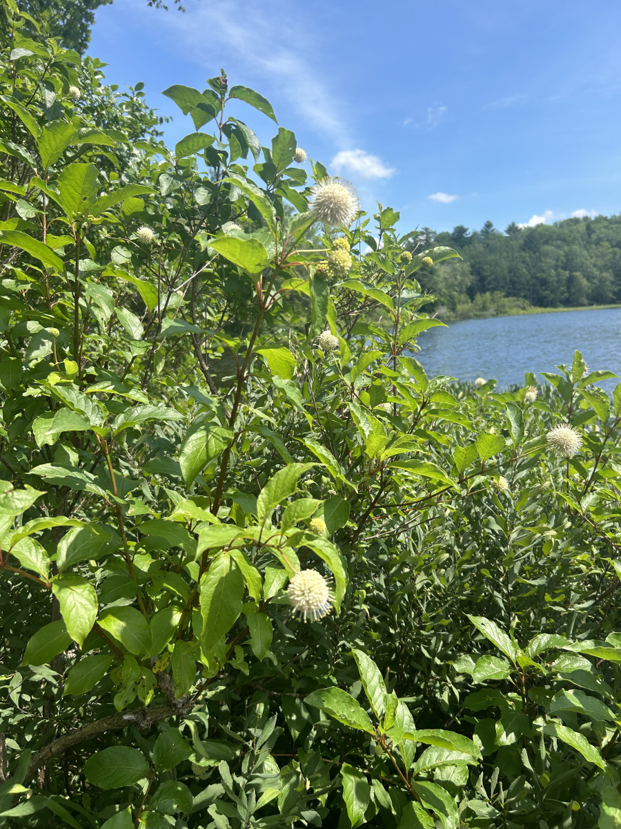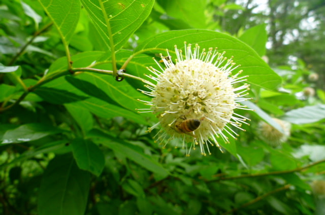 6-10' × 8' Loose rounded branchy shrub with masses of unusual spherical fragrant white flowers that appear for 4–6 weeks in summer—a magnet for every honeybee around.