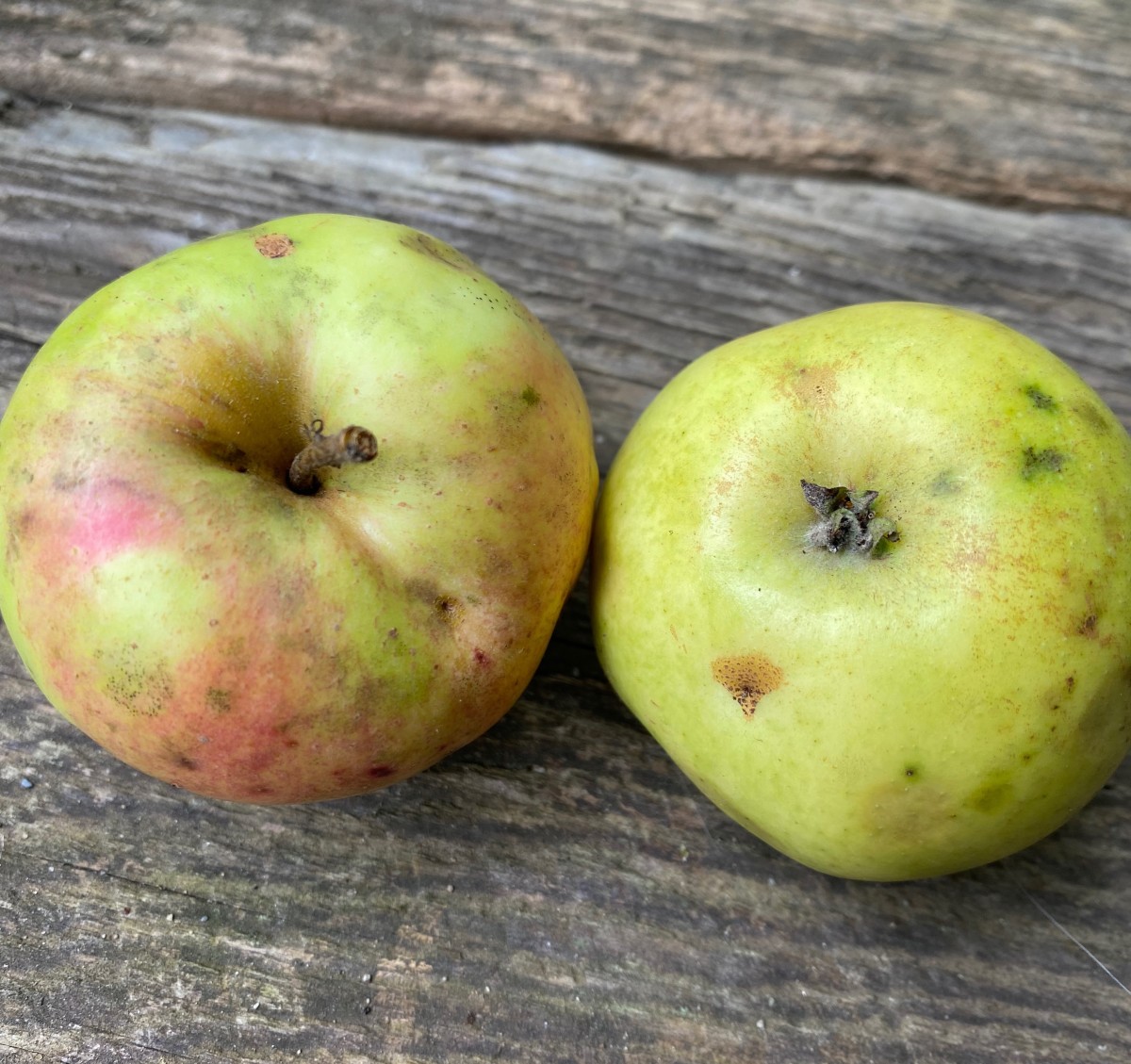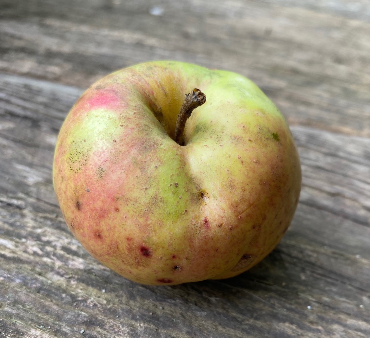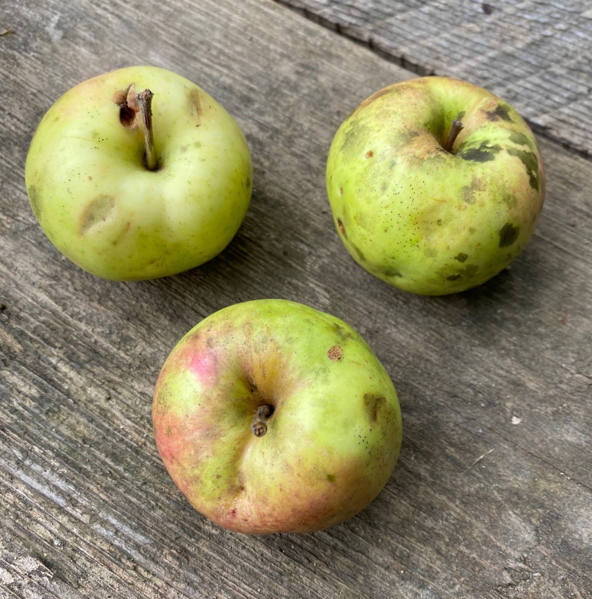 Discovered near an old overgrown cellar hole down the road from Whaleback’s orchard and cidery in Lincolnville, ME. Very bitter yellow fruit develops spots of pink and orange when fully ripe in mid-October. Gene says, “Intense tannins, not terribly juicy but can pack some sugars.” He measured a whopping 21 Brix in some highly colored specimens from the sunny side of the tree. Gene has artfully pruned the wild mother tree, but he still has to compete with the porcupines for a share of the large annual crop. Another one of the local discoveries on trial at MOFGA’s low-intervention no-spray South Orchard, where hopefully the quill pigs will stay away.