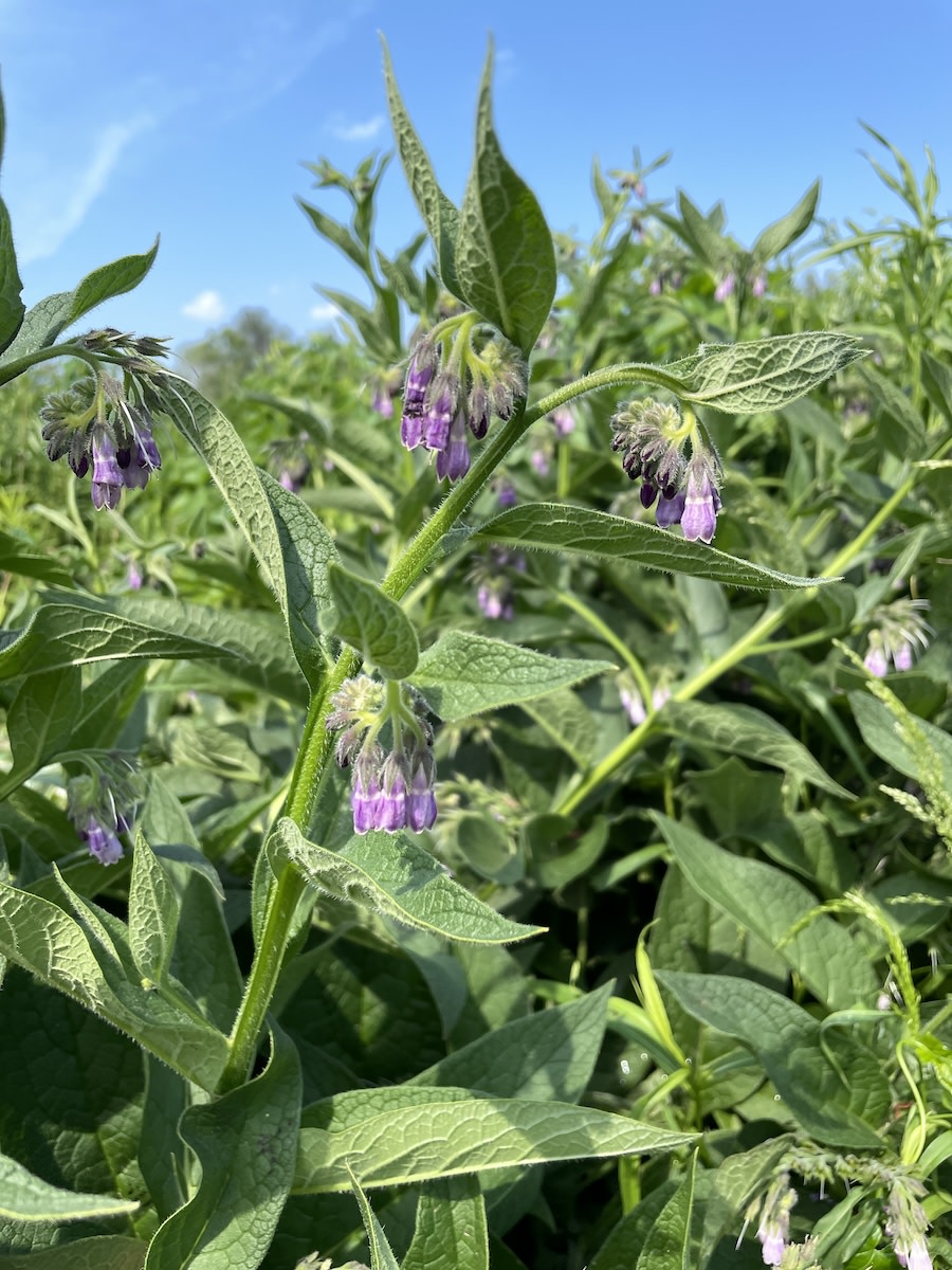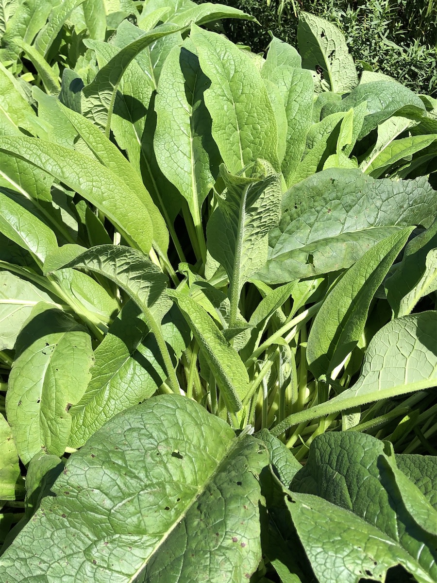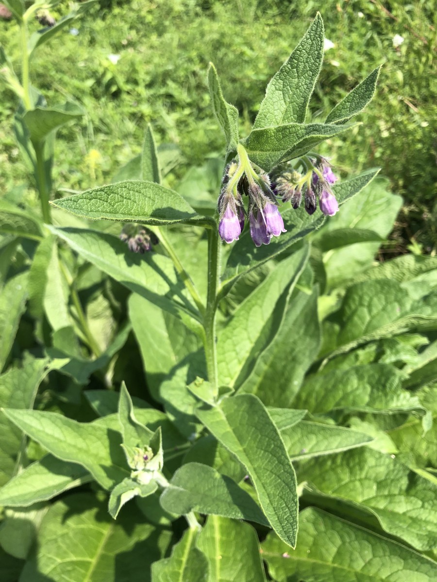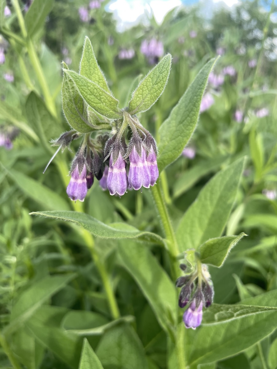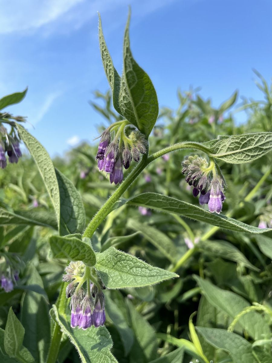 Clusters of bell-like pinkish purple flowers dangle above the deep green bristled foliage. Highly recommended as an orchard companion. Well known for its skin-soothing properties. Contains allantoin, promotes healing of skin and bone; also demulcent for lung and throat. Research on comfrey is inconclusive, but most agree that this species is the one to use medicinally.