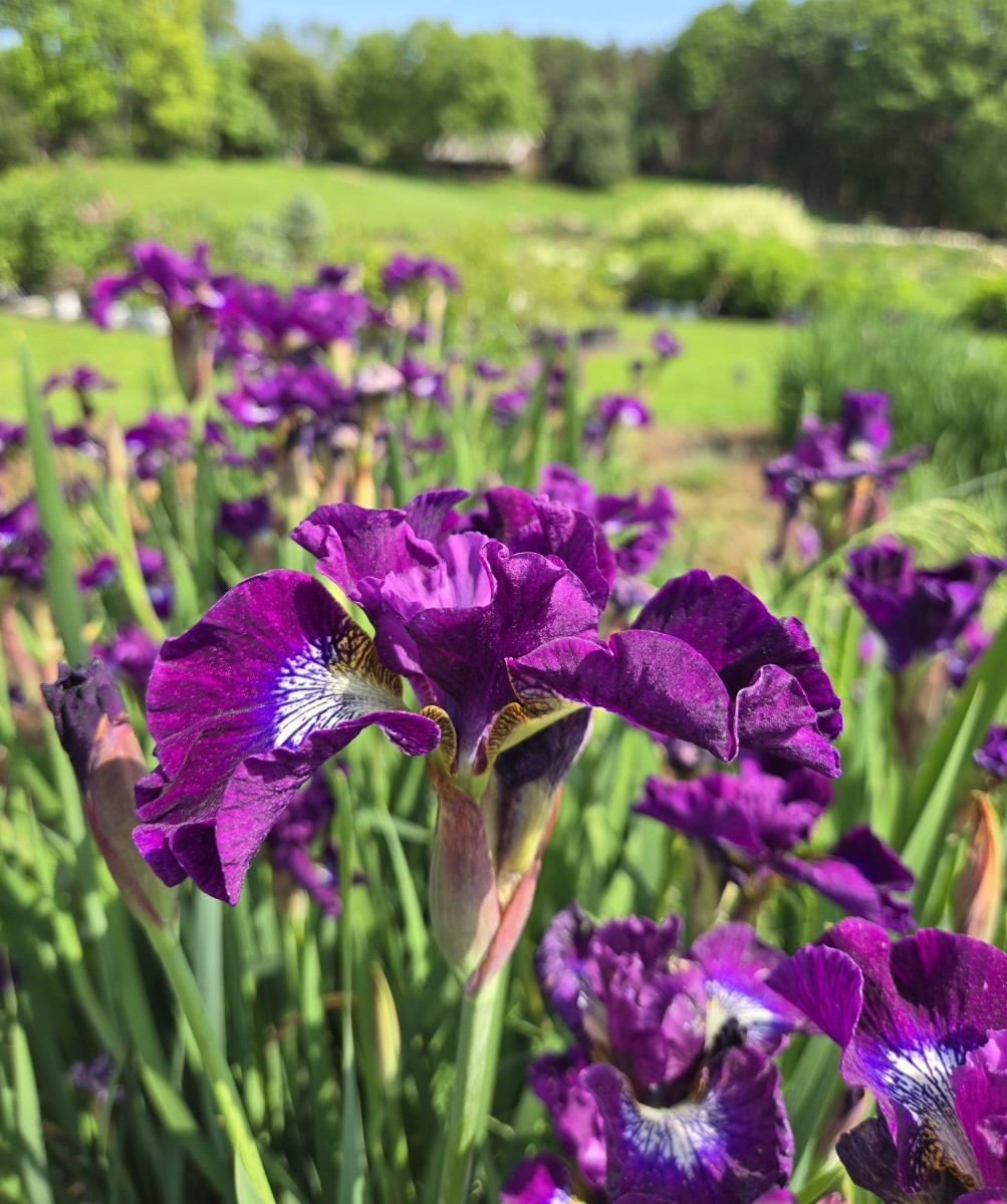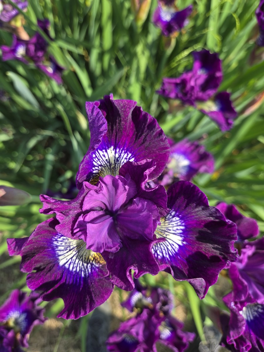 34" tall. Okay folks, truth be told, the standards and falls are not really crimson. They are more of a deep magenta-purple with prominent white signals and dramatic blue vein flashes just outside the signal, outlined by a fine white rim. This ruffled variety knocked our socks off with its surprising saturated color. Mid to late season blooms. Z3. (bare-root crowns)