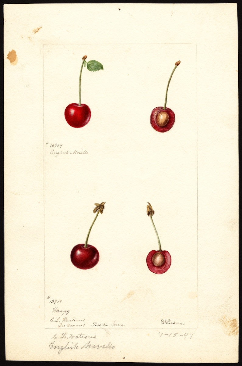 Netherlands or Germany, before 1860. Sometimes called Grosse Cerise à Ratafia, Grosse Lang Lothkirsche, Griotte du Nord, Morris and Colorado Morello.