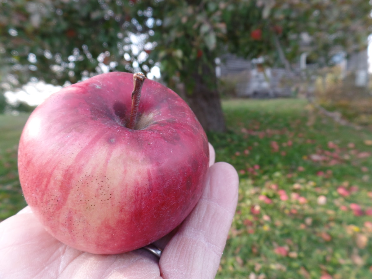 Medium-small roundish ruby-red thin-skinned fruit. Keeps until late December. As one of the few apples that comes relatively true-to-type from seed, occasional “variations on a Fameuse theme” can be found in old orchards. Thought to be a parent of McIntosh. Recent discoveries suggest that it could be one of the oldest varieties in North America. (For more details, you’ll have to check out John Bunker’s book: Apples and the Art of Detection!)