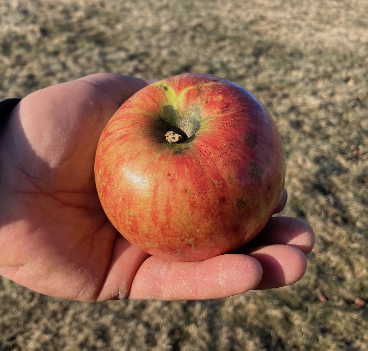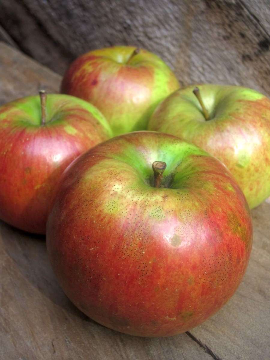 Extremely hardy, excellent storage variety. Large round-to-oblate shiny light red fruit with darker stripes and splashes of flame orange covering a yellow base. Firm crisp juicy yellow flesh is mild, approaching sweetness. Good for fresh eating, salads and baking. Maine grower Chris Willrodt sliced up a perfect specimen for us during a midwinter scionwood-collecting work day; it was still crisp, juicy and flavorful.