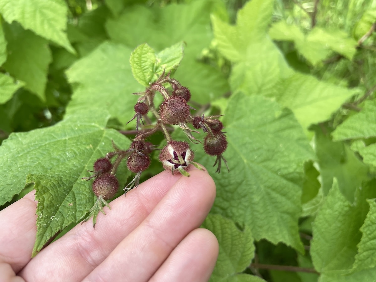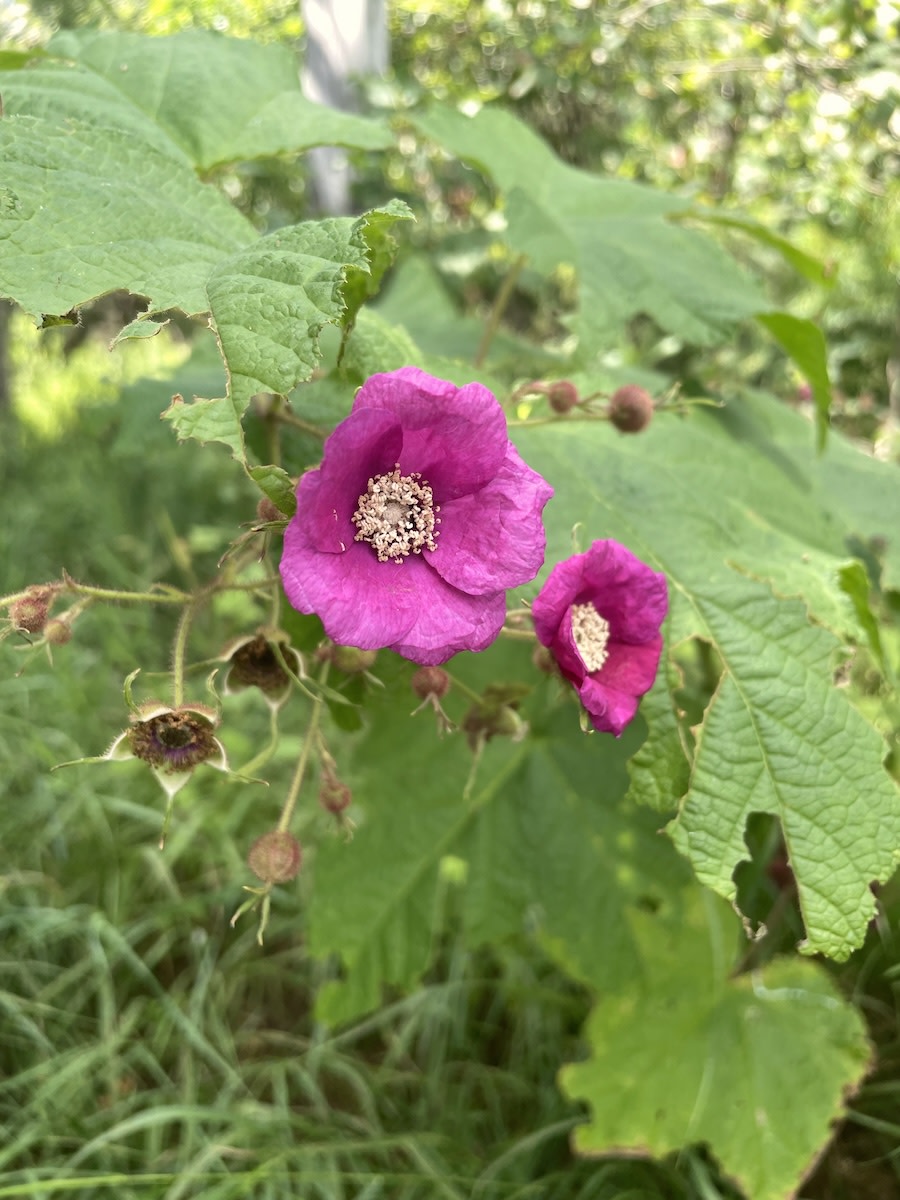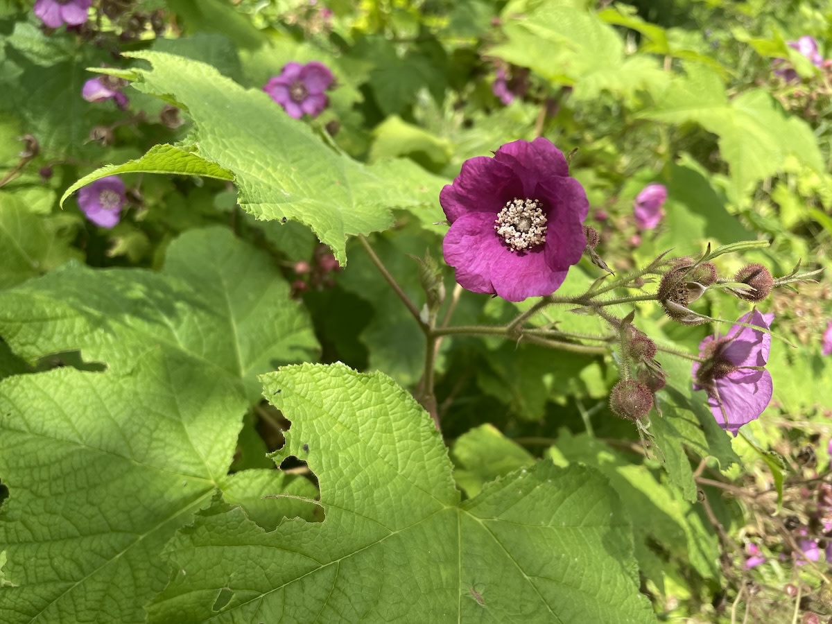 Relative of the cultivated raspberry, grown for its fragrant rosy-purple flowers and nutritious fruit. Long-blooming, from June to August, attracting pollinators. An excellent addition to wildlife hedges. Thornless canes sucker and spread into a dense colony. Berries contain phytonutrients ellagic acid and resveratrol, regenerative and beneficial to health. New leaves can be made into a medicinal tea much like its fruiting cousin, the red raspberry. Lobed palmate leaves fade to pale yellow in the fall.