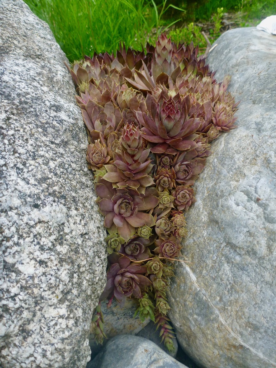 If you’ve got boulders in the back forty or a rocky sandy sun-drenched spot in the dooryard, you have the makings for an amazing cascading Sempervivum display.