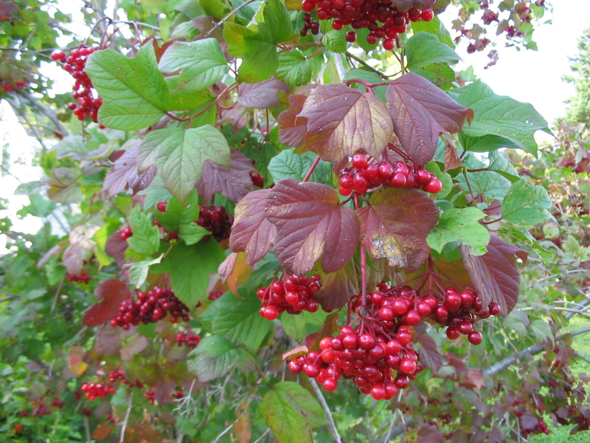 Clusters of lovely 4" flat white flowers in May attract beneficial insects. Pendulous bunches of red berries ripen mid-October, popular with dozens of bird species. Fruit is extremely rich in antioxidants and vitamins A and C. Berries can be used for juice, jam, fruit leather and syrups—when boiling them down, don’t let the somewhat unpleasant odor deter you. Bark is one of the most effective anti-spasmodic medicinals. Good for screens and hedges. Not to be confused with low-growing American cranberry familiar in sauces.