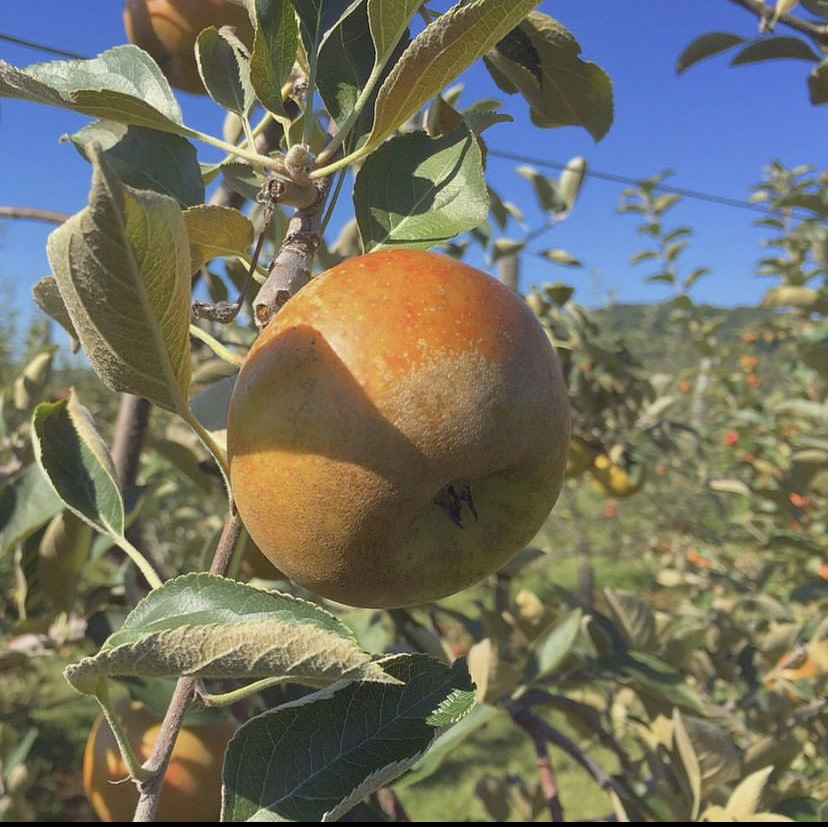 Very attractive deep yellow fruit is blushed and streaked with reddish-orange, with a russeted stem cavity. Larger than its parent Cox, round ovate with flat shoulders and a funny slant to one side. Creamy yellow flesh is firm, juicy and aromatic with a balance of sweet and tart, and tropical hints. Great for dessert. Holds its shape in pies and presses into a pleasant orange-colored juice. Some disease resistance. Triploid: will not pollinate other apples. Blooms midseason. Z4.