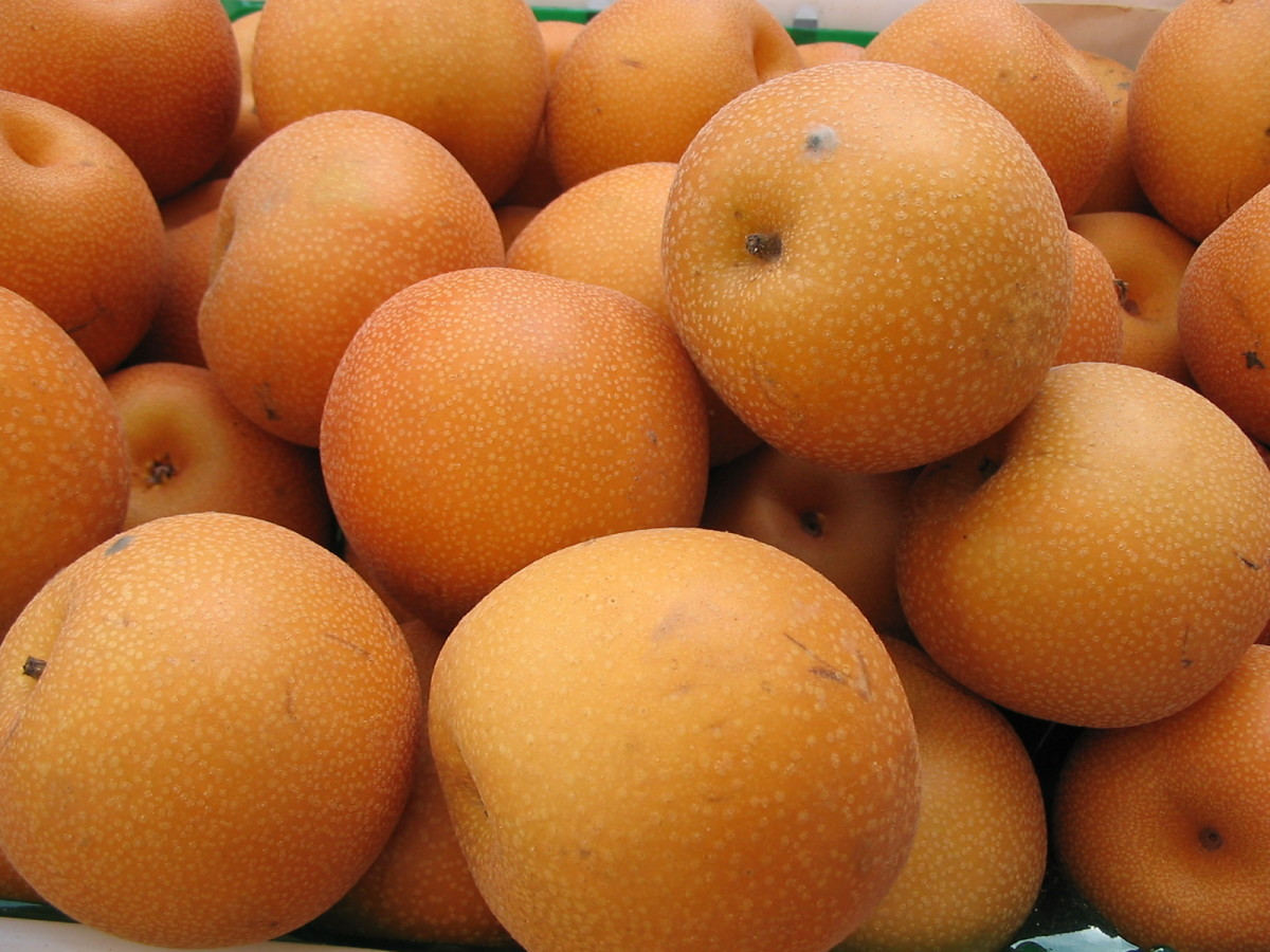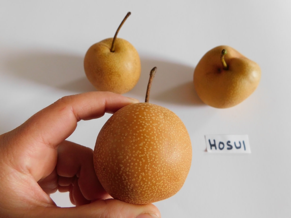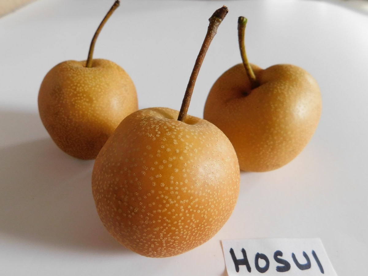 Firm crisp fine-textured juicy mild subacid yet sweet rich-flavored white to off-white flesh is considered by some to be the best-flavored of all Asian pears. Large round-oblate long-stemmed fruit with medium-thick skin covered with glowing yellow-orange-golden brown russet and numerous light-russet dots. Standard commercial variety. Will store for a month. Hosui means ‘much water.’