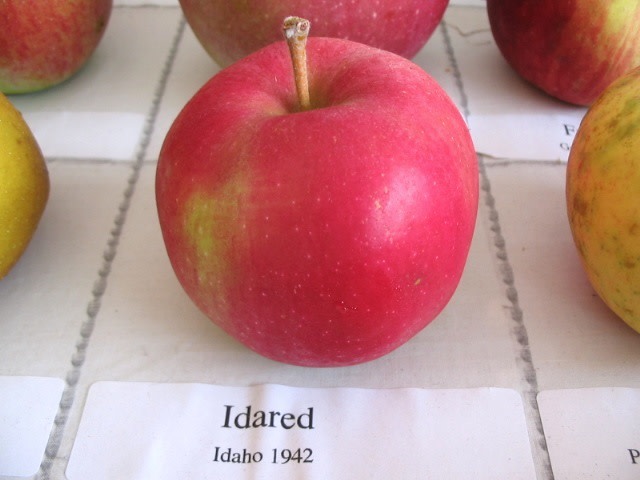 Medium-large roundish ever-so-slightly ribbed fruit, almost entirely blushed with a solid bright cheerful “1940s red.” Sometimes with a russet patch around the stem. Firm smooth fine-grained juicy pure white flesh is mildly yet decidedly tart, with enough flavor to distinguish it from the more tasteless sweet inventions of recent times.