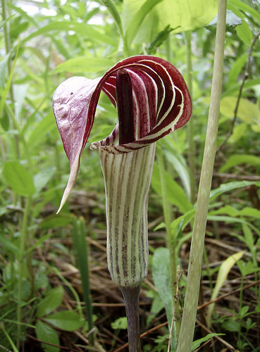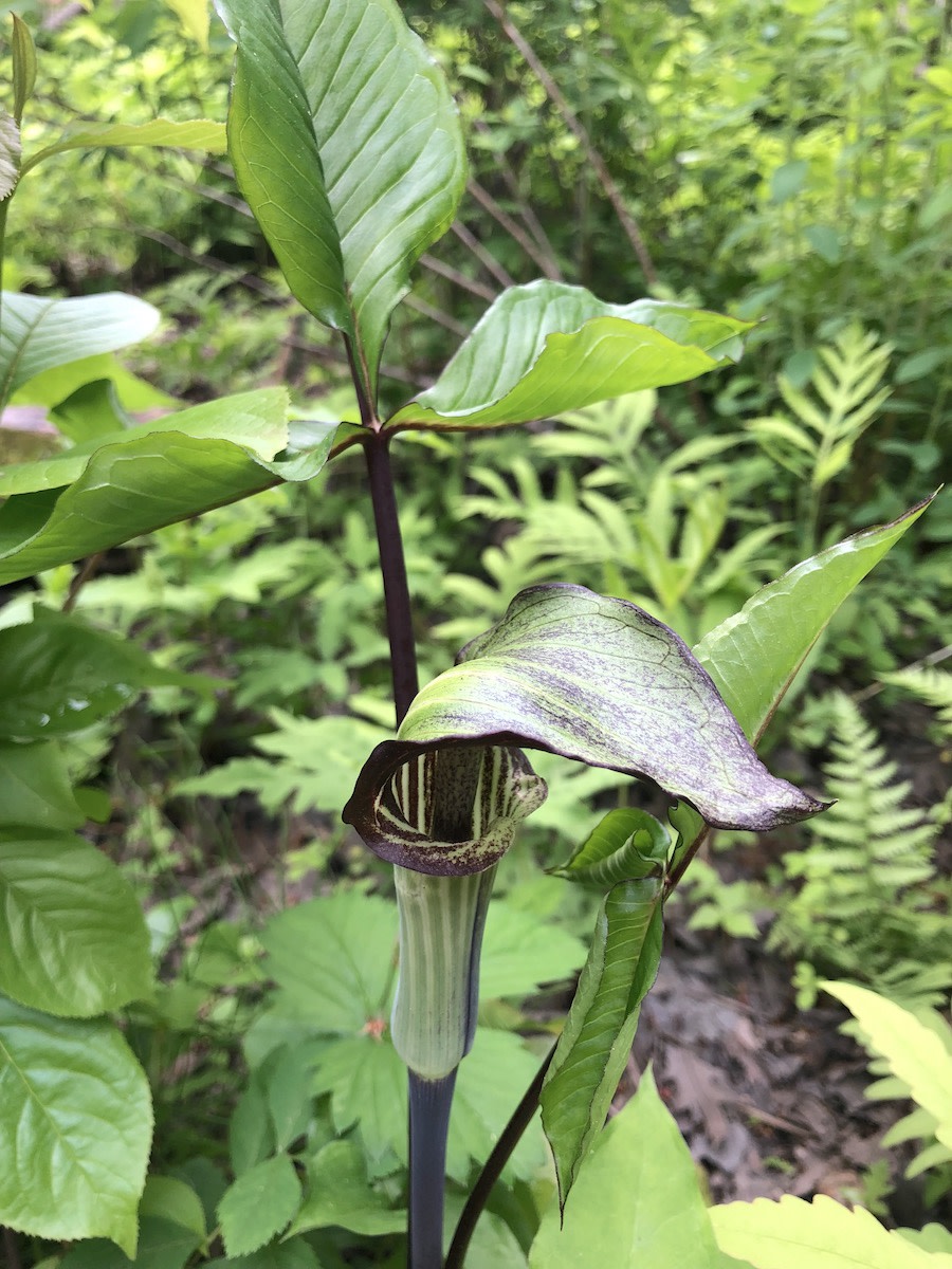 In midspring, one or two compound leaves appear close to the ground, each with three leaflets framing an upright stem topped by a striped tannish-purple 3" long cuplike spathe (the pulpit) that contains and arches over the erect greenish-yellow spadix (Jack). It’s always a delight to lift the flap and see Jack.