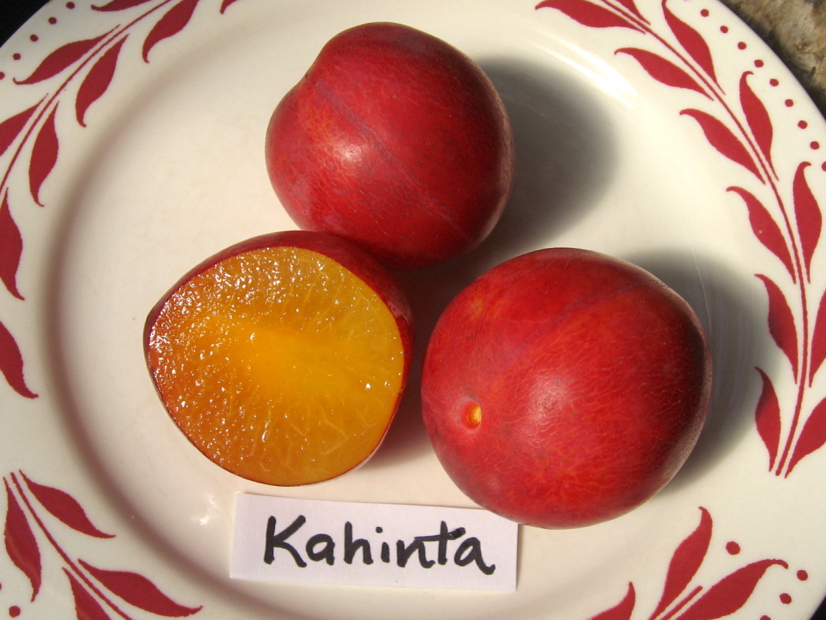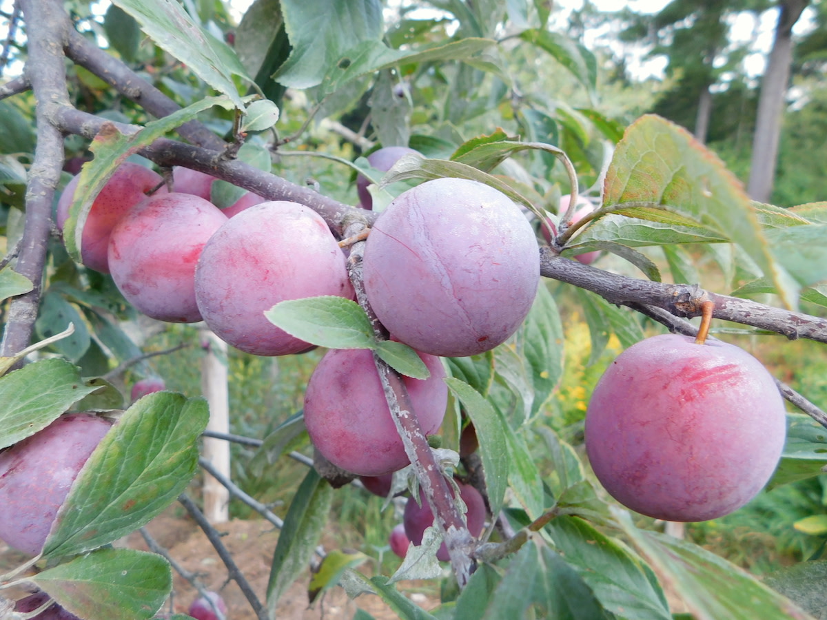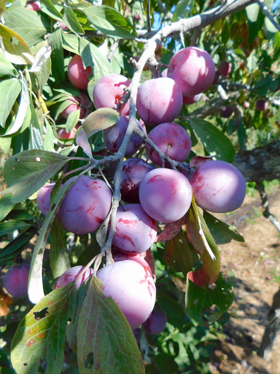 Large 1½" roundish slightly pointed fruit is flattened at the stem end. Brilliant red-purple tart skin and translucent yellow-orange tart but quite flavorful flesh. Easy to peel; peeled fruit looks like a peeled tangerine. Or you can bite a small hole in the skin and suck out the juicy flesh. Clingstone. Very good for fresh eating or canning.