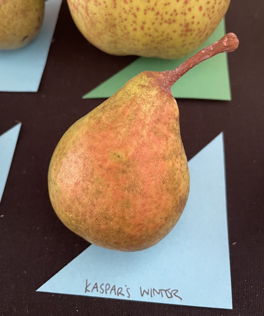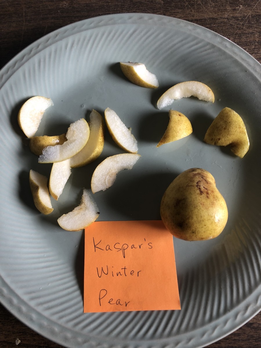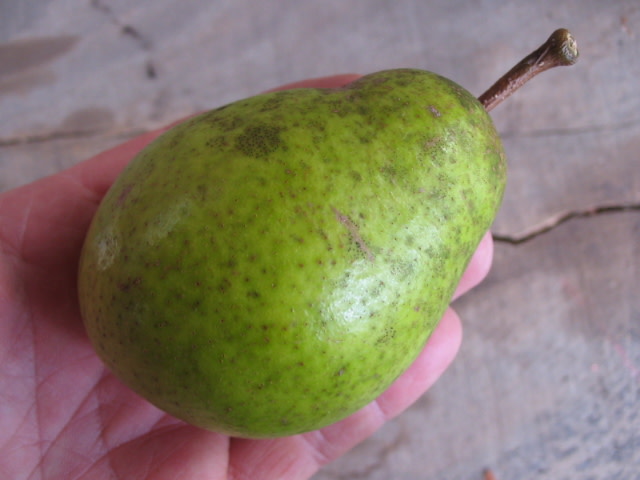 Very good tough-skinned storage pear—will keep until April in the root cellar. Greenish-mottled medium-small pear-shaped fruit with some russet splashes or dots. Coarse flesh with a floral, vanilla cake flavor. Very hard off the tree; don’t begin to eat them until a month after picking. Years ago this nameless winter pear found its way from the roadside near Frankendorf to Unity, Maine. The name came later, courtesy of grower Howard Wulf who calls it “the latest-keeping pear I’ve ever seen.”