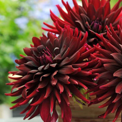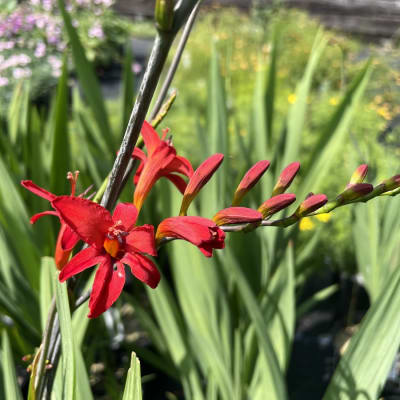 Crocosmia × crocosmiiflora 24-36" tall. Midsummer sprays of bright red flowers open from bottom to top on long arching bronze stems. Grows well in pots. Makes a long-lasting cutflower.
