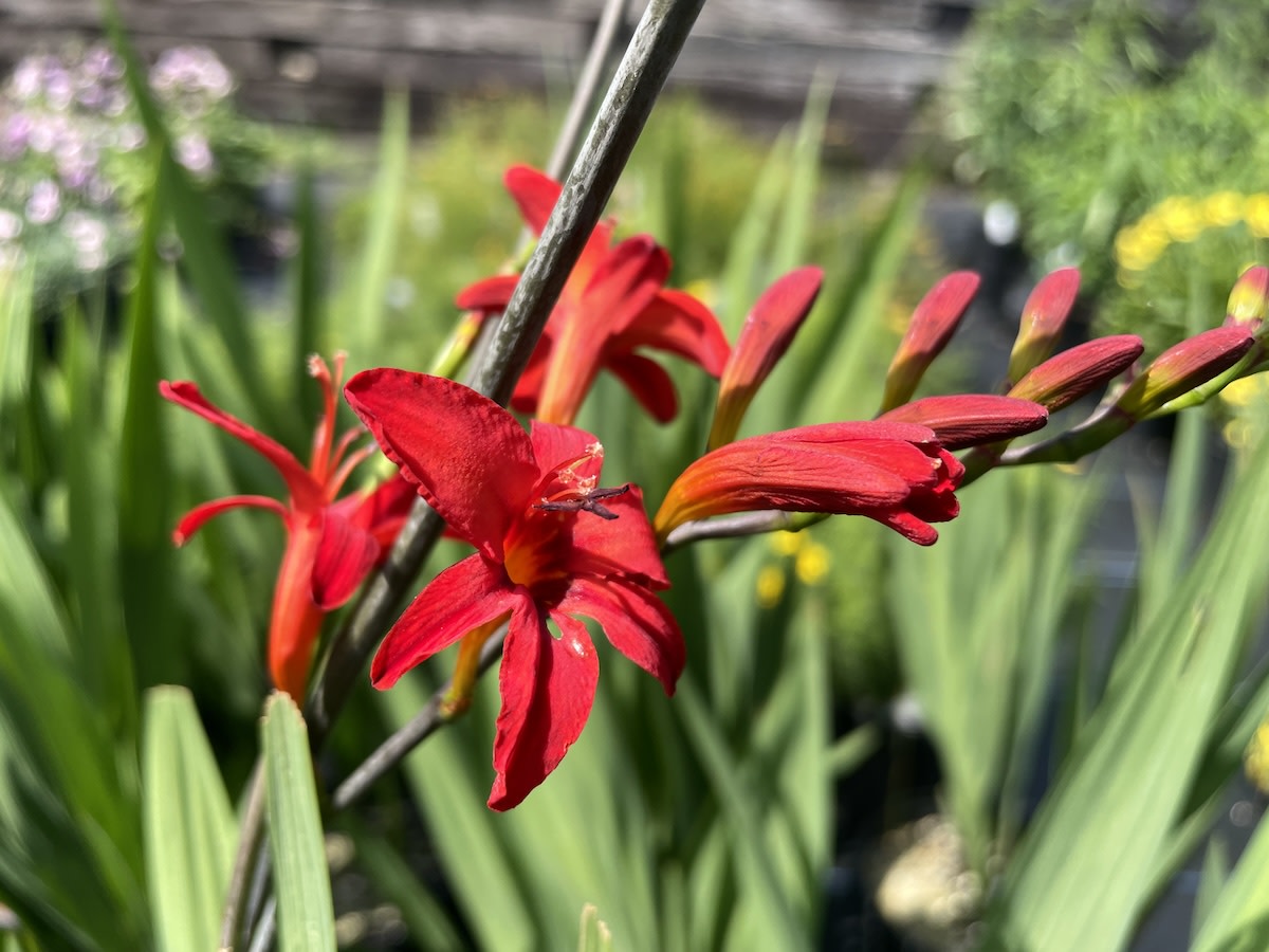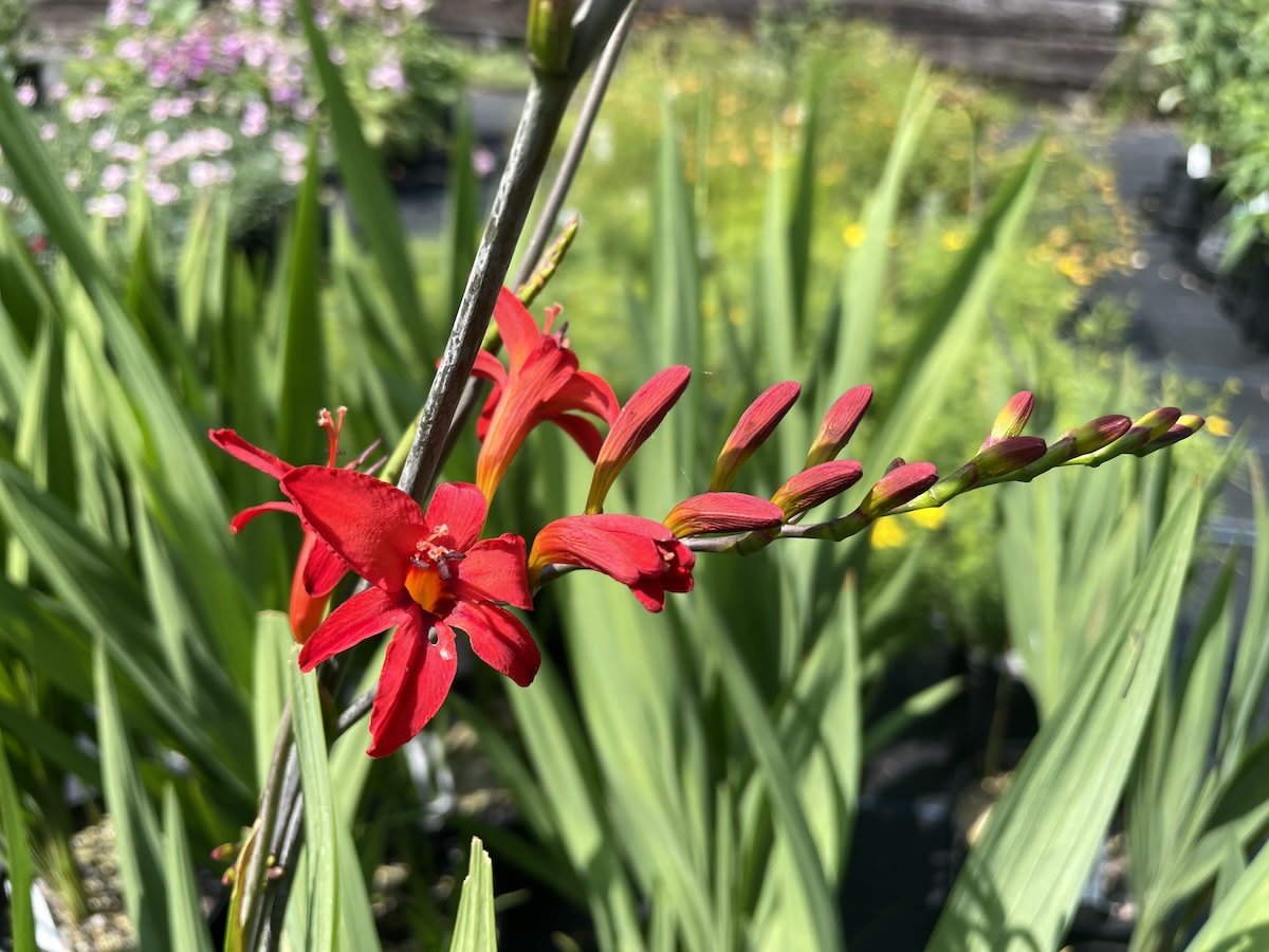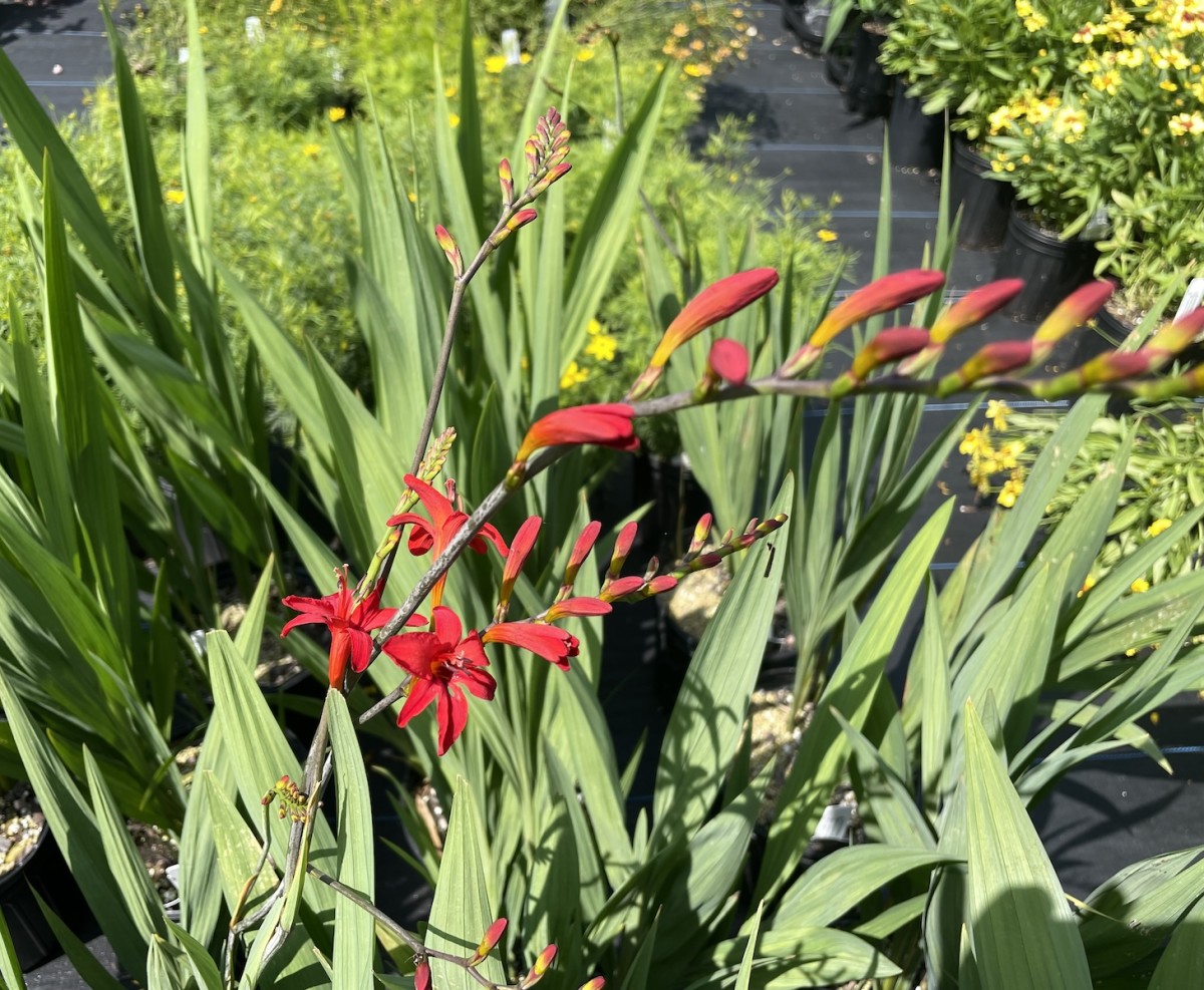 Midsummer sprays of bright red flowers open from bottom to top on long arching bronze stems, like bursts of flame above gladiolus-like foliage. Frequented by the ruby-throated hummingbird all day long. Lucifer is Dutch for ‘match,’ and in most shops in Holland you can pick up a box of lucifers—they’re kitchen matches.