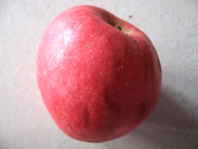 Medium-sized pinkish-rosy-red roundish-oblate-conic fruit, sometimes ribbed and usually featuring a small yellowish russet splash around the stem. One of the English varieties now becoming popular in the U.S.