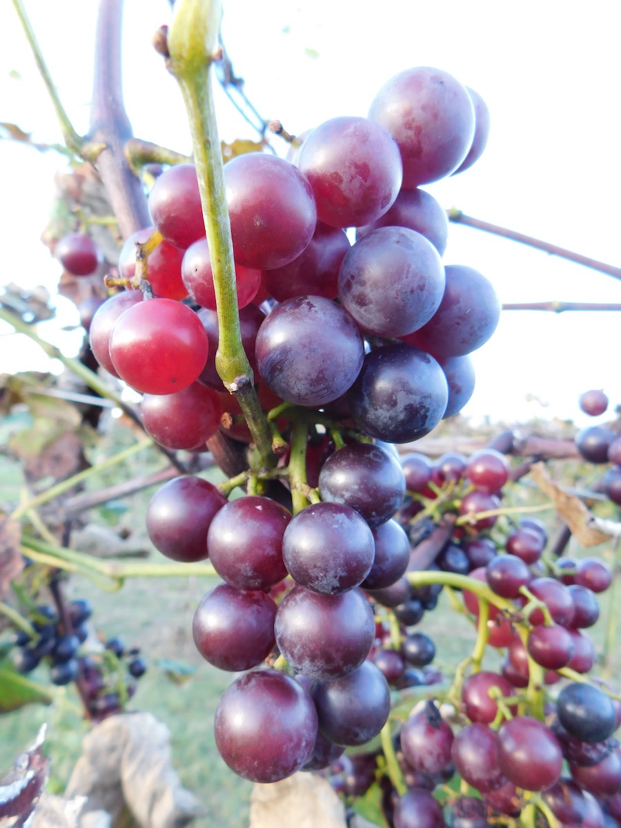 Large seedless blue berries good for fresh eating, juice or raisins. Typical labrusca foxiness of Concord-like grapes. Big orbs, though might not accommodate a Rover. Thick slipskins are resistant to cracking and one of the best for disease resistance, performing well during hot wet summers. Very vigorous vine showed hardiness after –20°. Z5, but definitely worth trialing in Z4. (well-rooted vines)