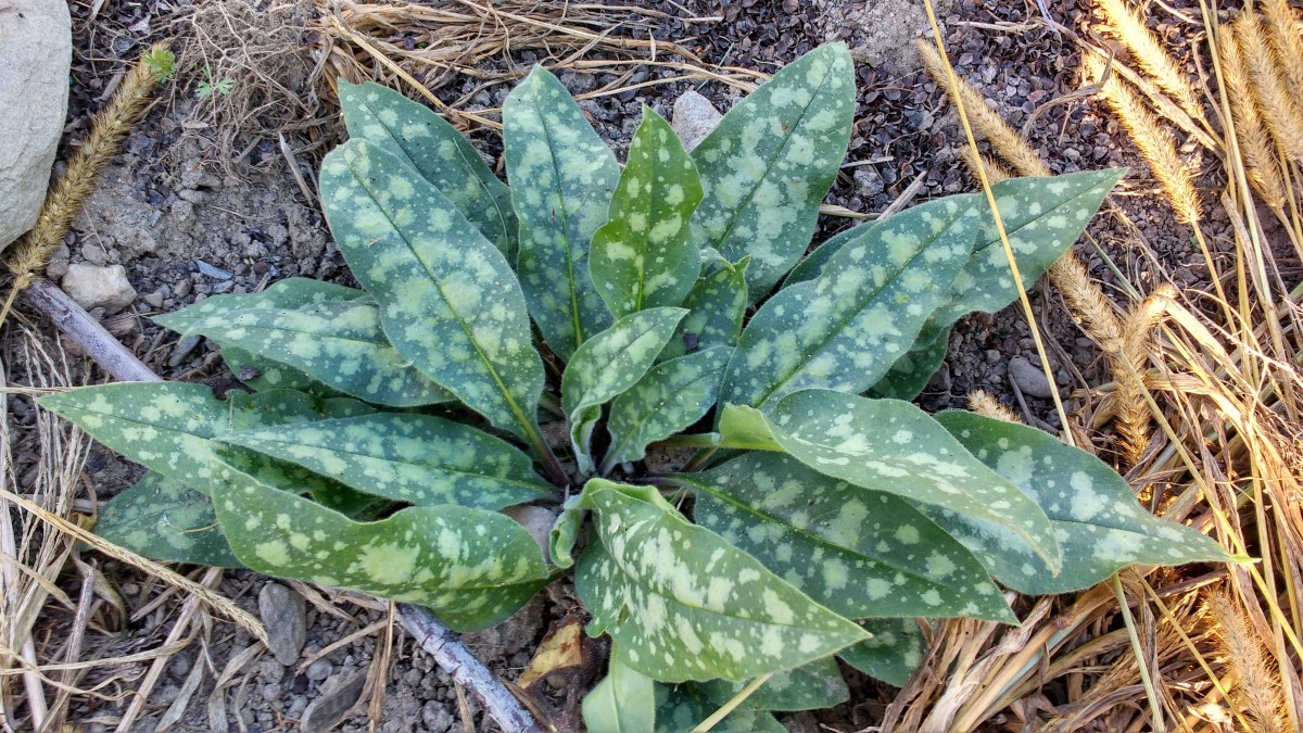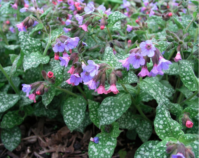 Brighten up your shade garden with boldly textured periwinkle-blue buds that open to charming long-lasting pink flowers—a striking effect when both colors appear at once. Large ovate slate-green leaves are dressed in vivid silver-white splotches. Foliage will look good all summer if plants don’t dry out. A brilliant early season contrast to blooming daffodils and emerging hostas and ferns. Not generally considered a hummingbird plant, but Deb Soule of Avena Botanicals recommends it for our wee feathered friends, as do we.