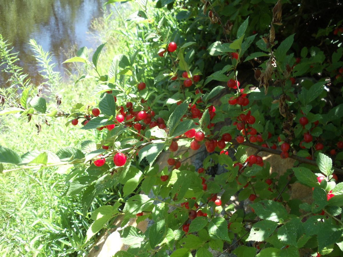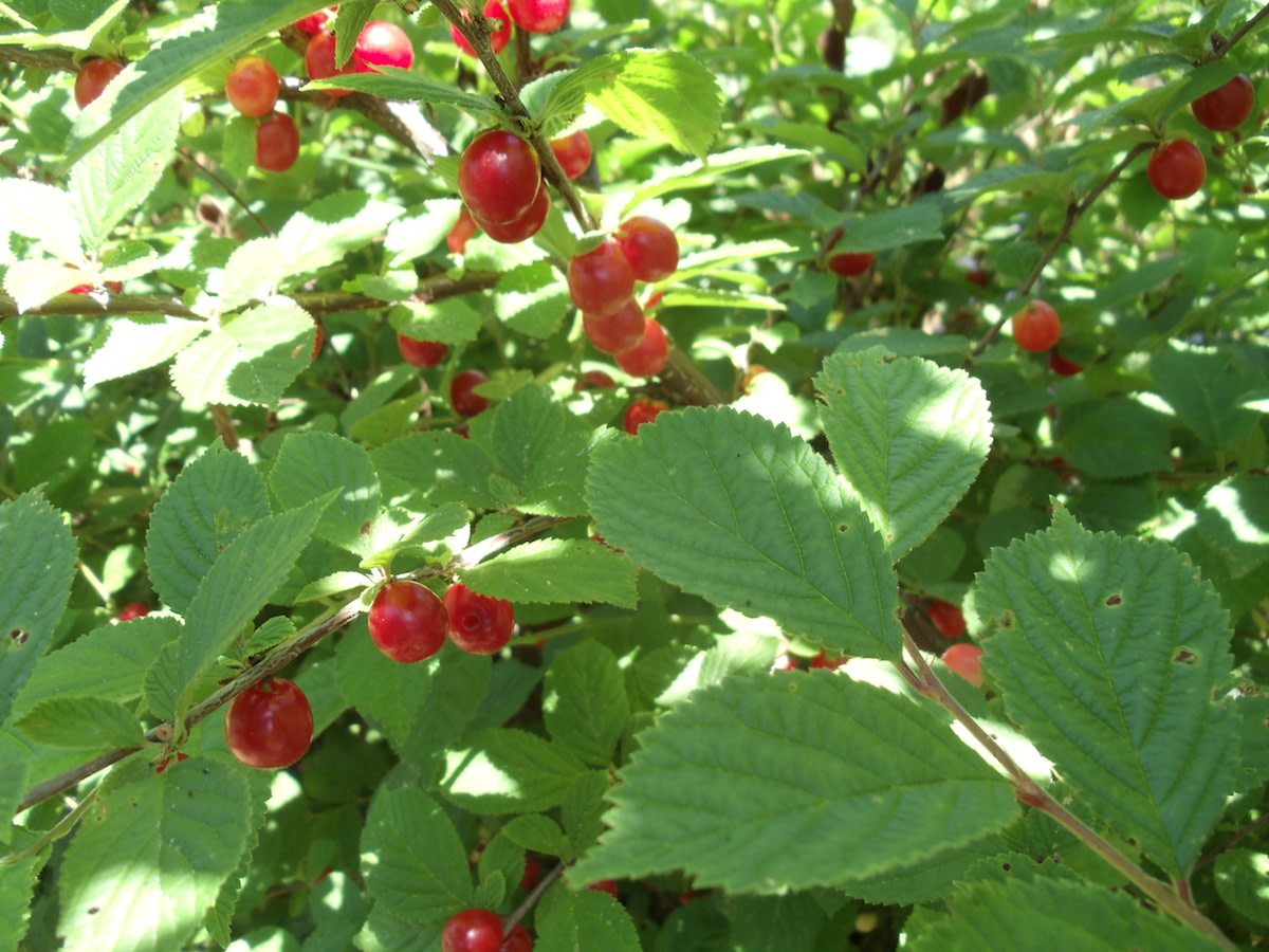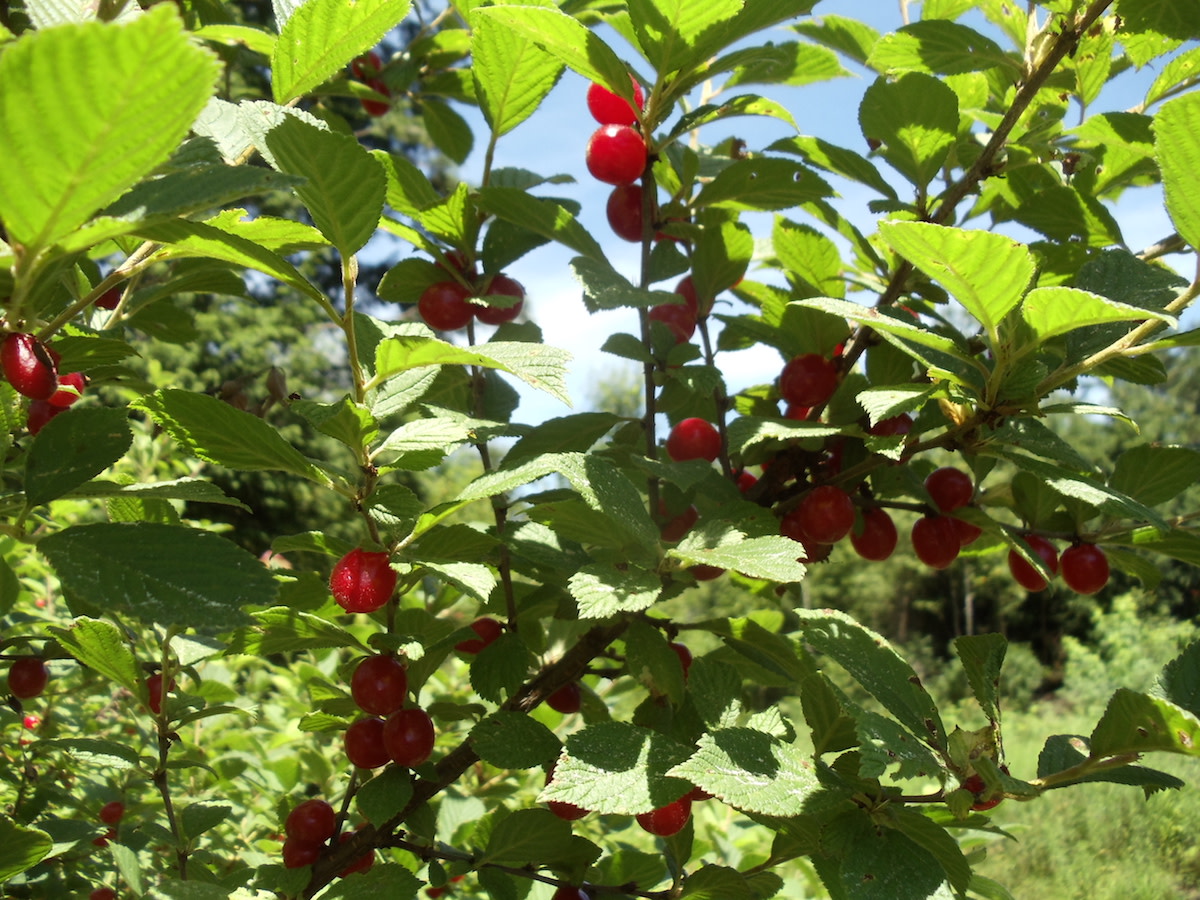 Excellent hedge plant: an edible landscape plant that produces a lot of tasty fruit! Variable ½" fruit in early summer ranges in flavor from mild to tart and in color from scarlet to clear red to pink and sometimes even white. Eat fresh or frozen. Excellent jelly and fruit leather. Said to make a good pie but pitting would require quite a bit of work. Covering plants with netting will deter birds from robbing your crop.