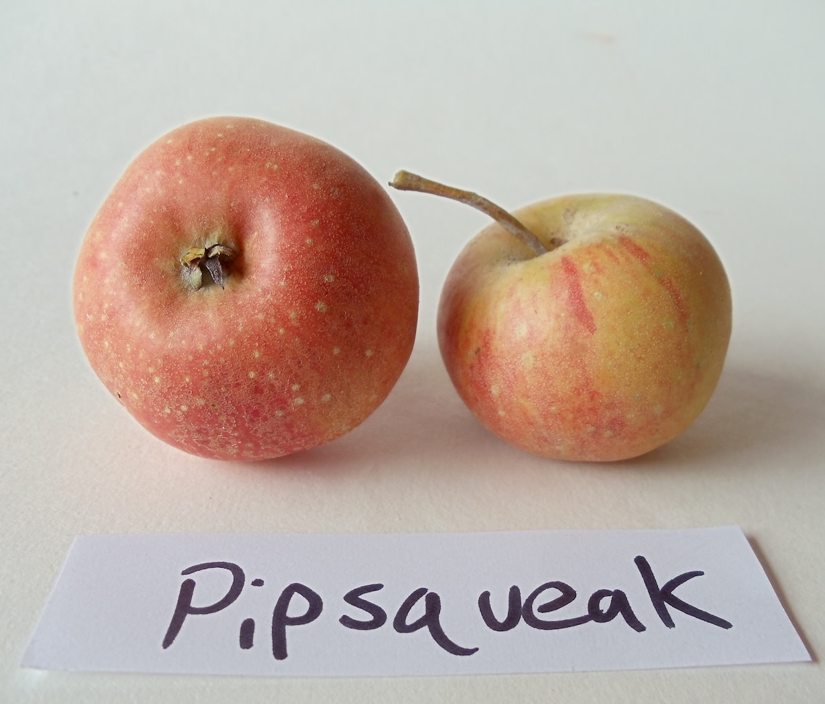 Small russeted dessert apple with a long stem and a few faint pinkish-orange stripes. The rough skin almost feels like a kiwi. A large Pipsqueak might approach 2" in diameter. For such a diminutive fruit it packs a lot of flavor. We eat them raw or baked whole rolled in cinnamon and sugar. One of our friends called it “the best apple I’ve ever eaten.” It’s surprisingly juicy, full of good flavor—tropical like a piña colada. Great fresh-eating crabapple—rivals Trailman. Ripens around October 1 in central Maine. A favorite of the kids at the Community School on Mount Desert Island in the fall of 2015.